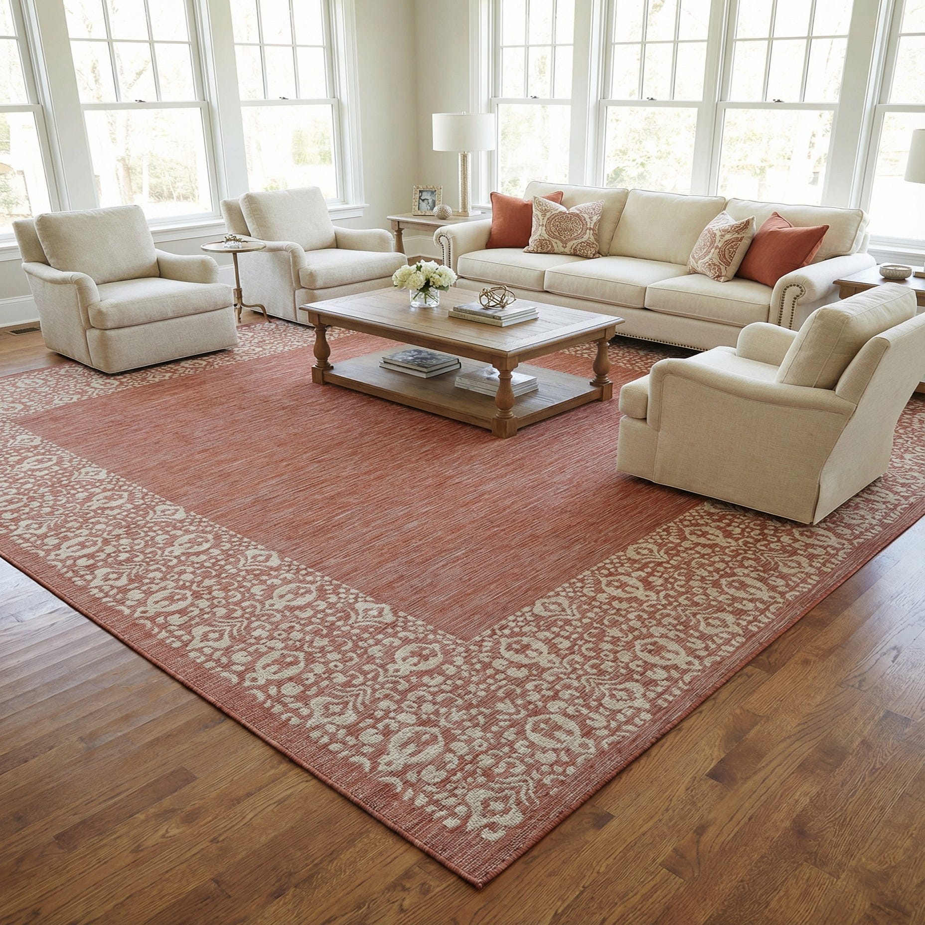 Primary color is Rust Red. Colors in this rug include: Rust Red, Ivory.