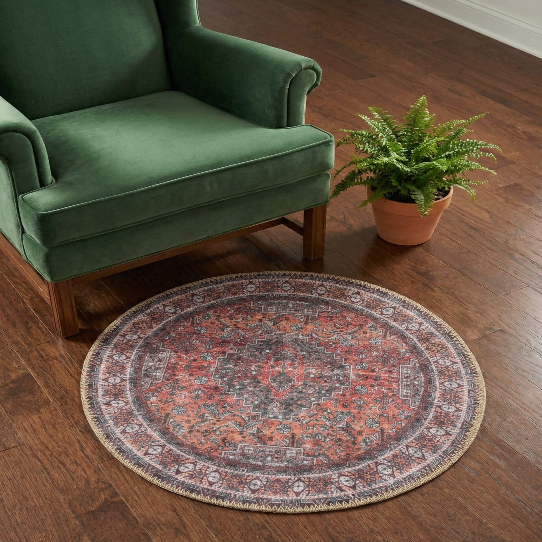 Primary color is Rust Red. Colors in this rug include: Rust Red, Beige, Black, Blue, Brown, Ivory, Navy Blue, Orange.
