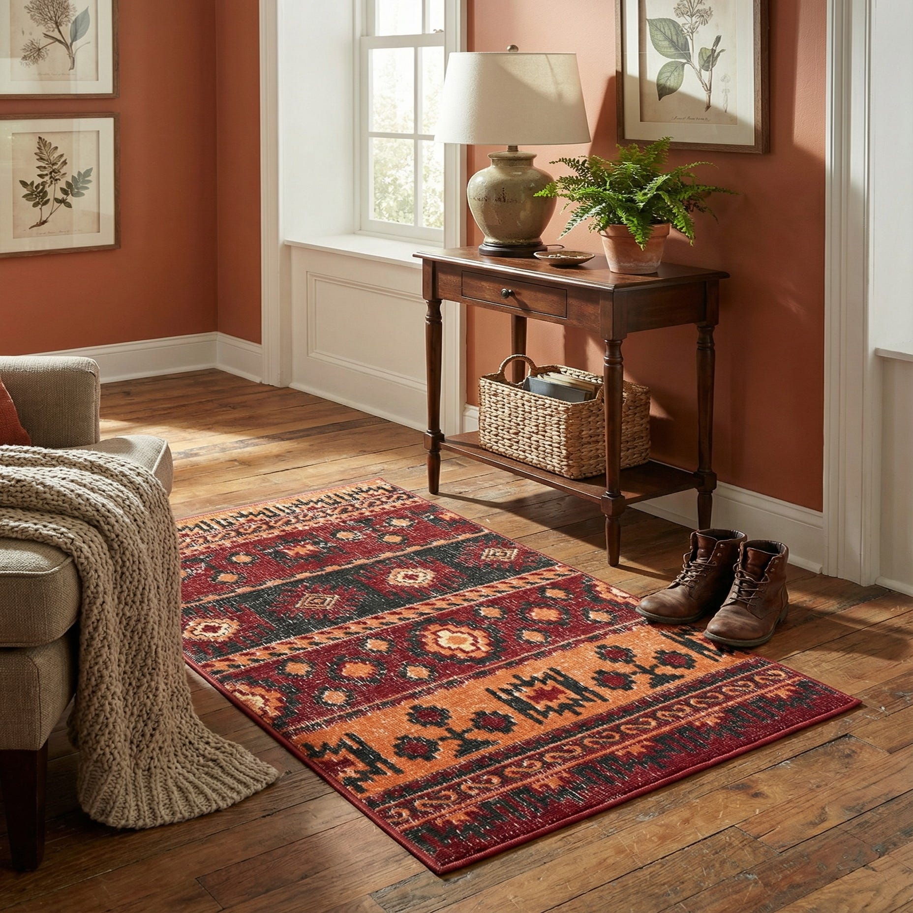 Primary color is Rust Red. Colors in this rug include: Rust Red, Black, Ivory, Orange.