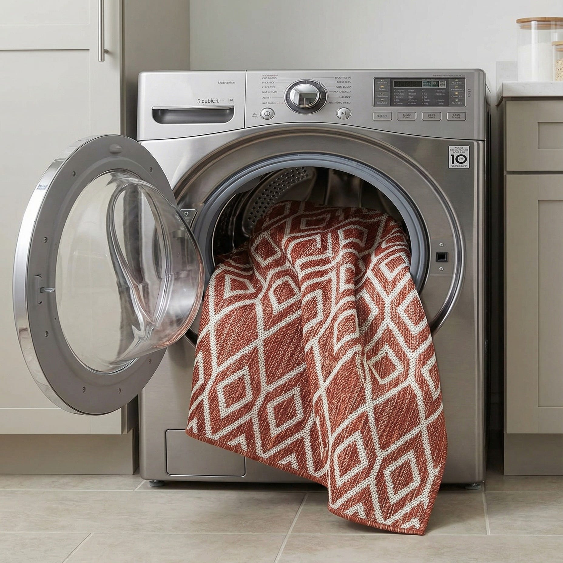 Primary color is Rust Red. Colors in this rug include: Rust Red, Ivory.