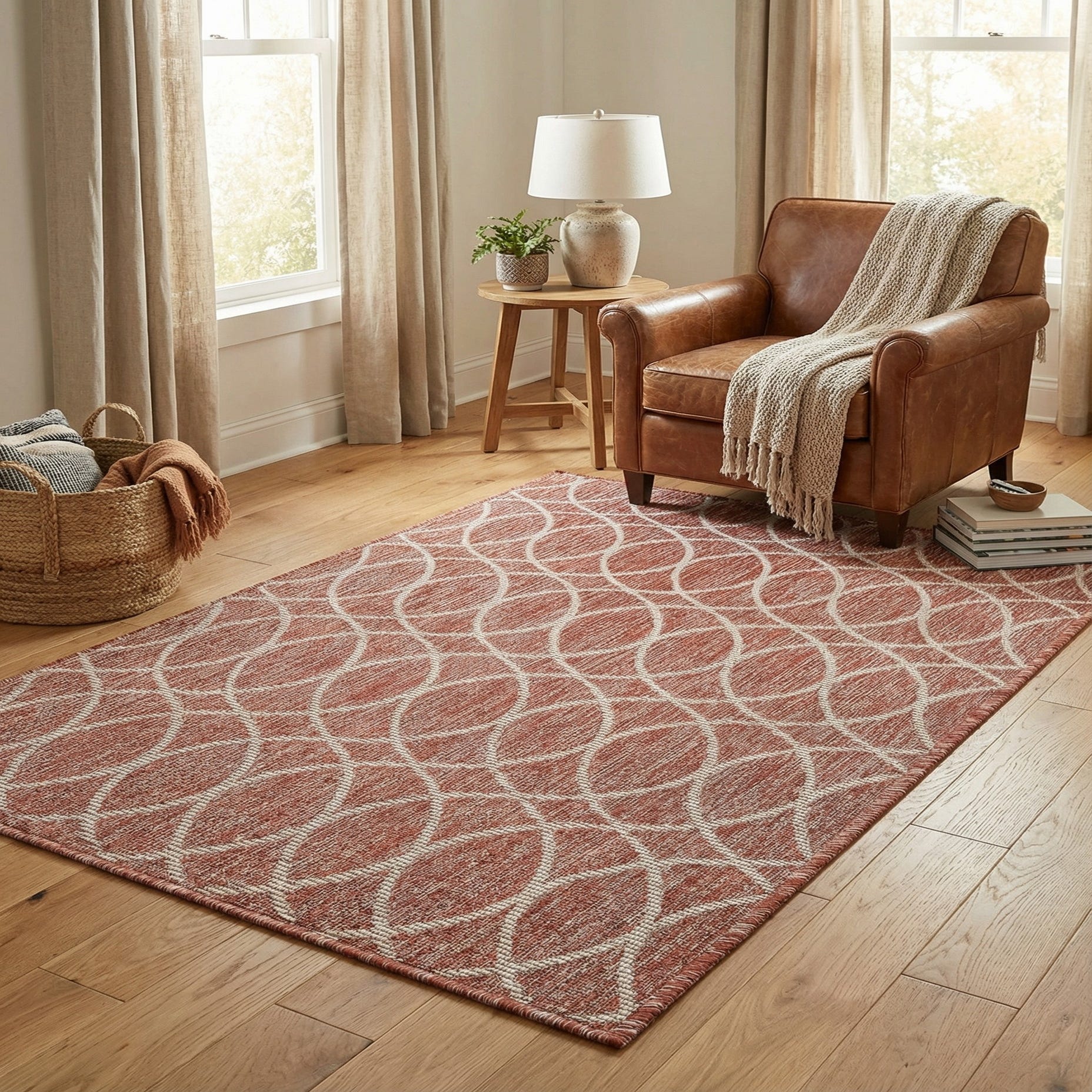 Primary color is Rust Red. Colors in this rug include: Rust Red, Ivory.