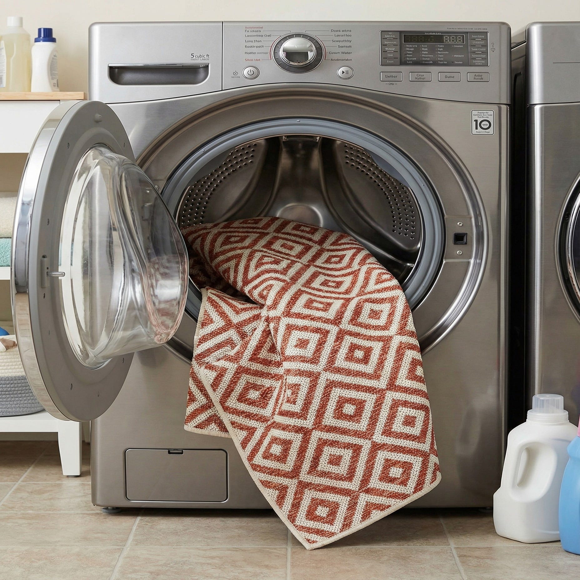 Primary color is Rust Red. Colors in this rug include: Rust Red, Ivory.
