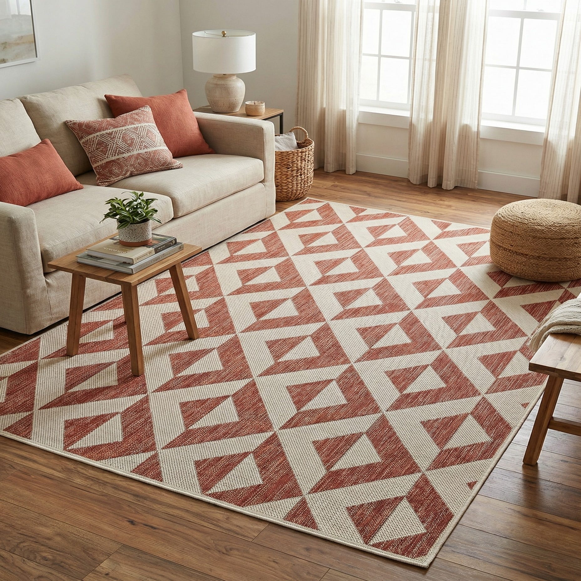 Primary color is Rust Red. Colors in this rug include: Rust Red, Ivory.