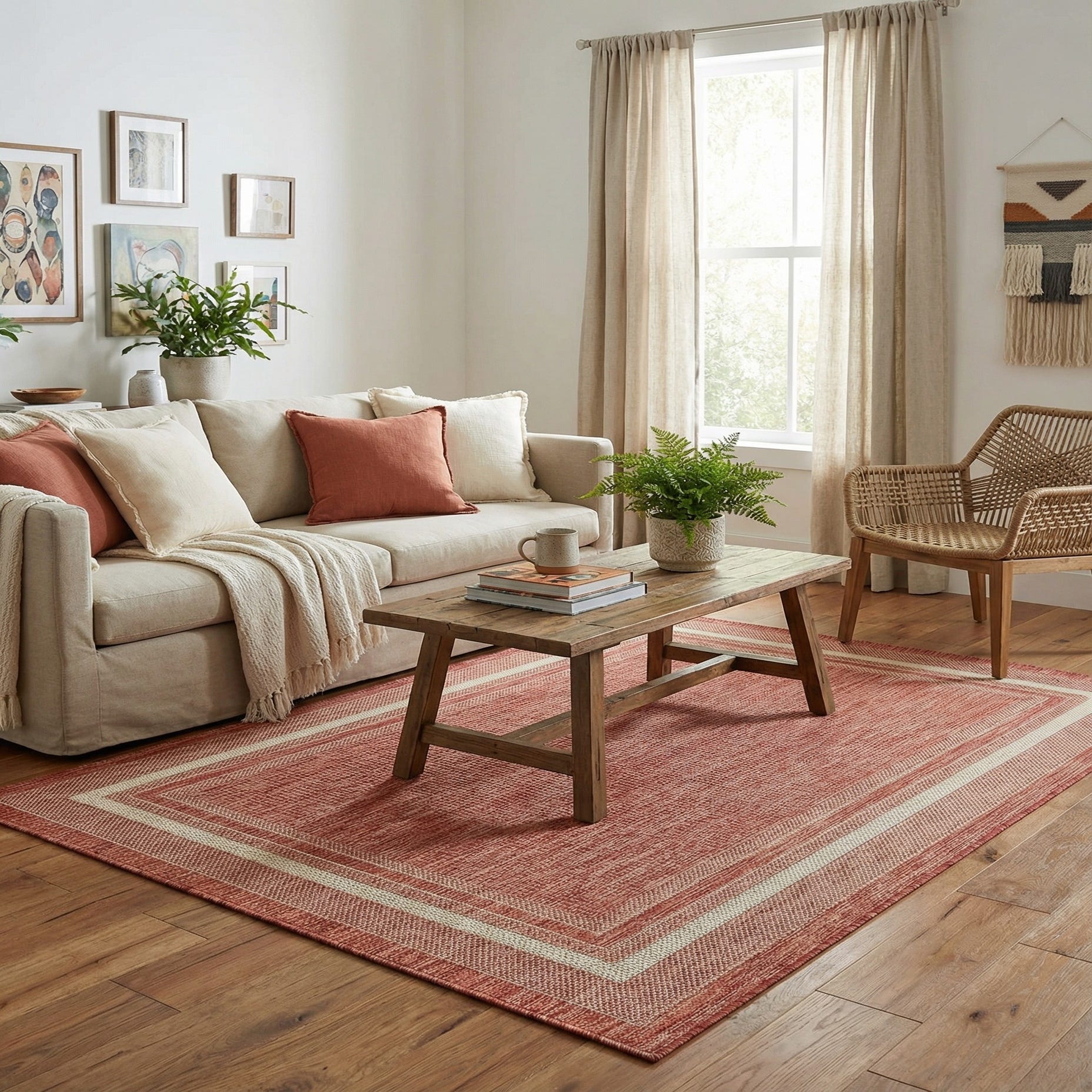 Primary color is Rust Red. Colors in this rug include: Rust Red, Beige.