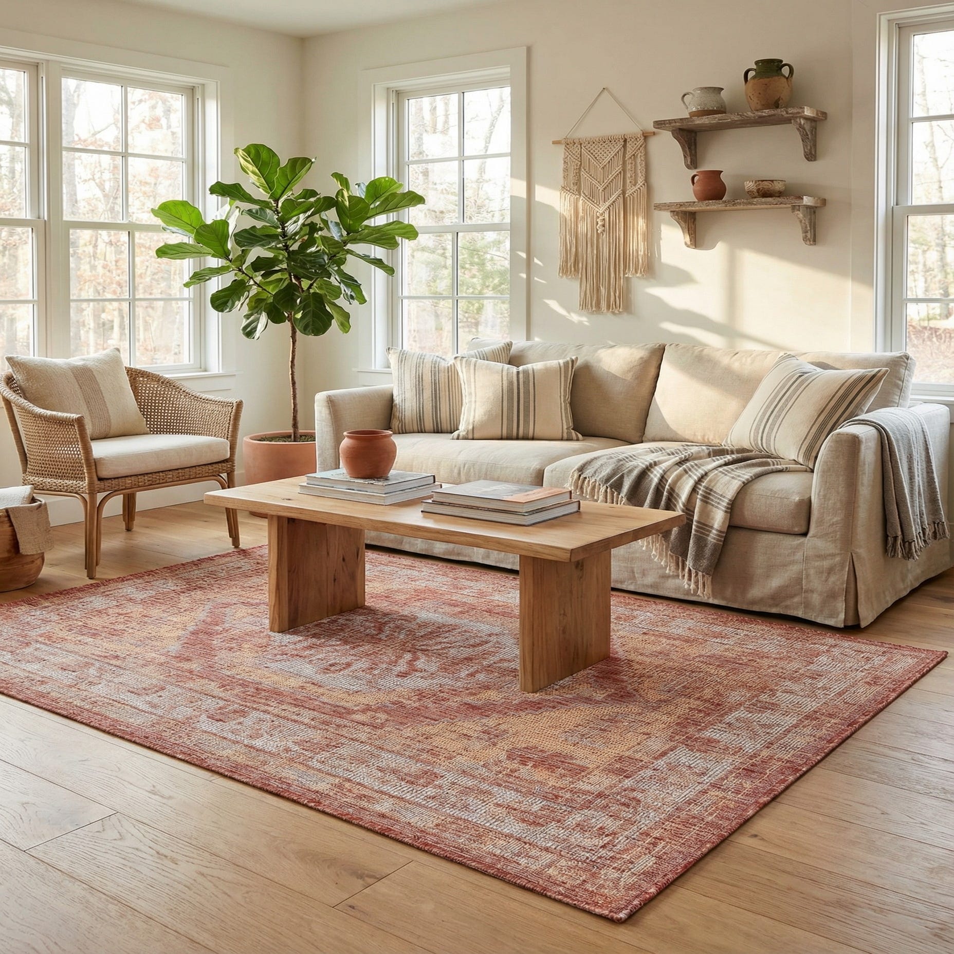 Primary color is Rust Red. Colors in this rug include: Rust Red, Beige, Ivory, Gray.
