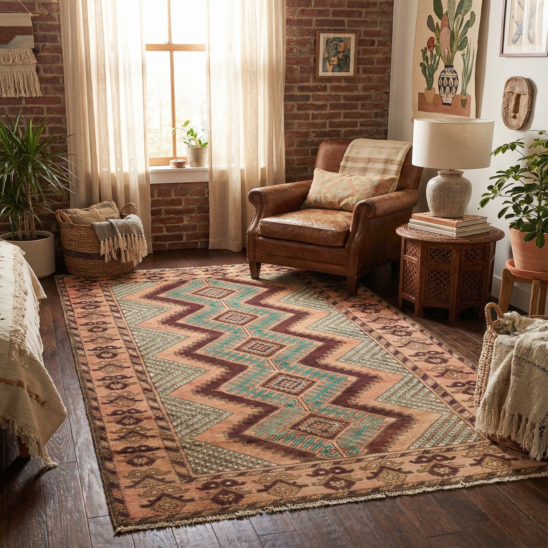 Primary color is Rust Red. Colors in this rug include: Rust Red, Brown, Ivory, Light Brown, Green.