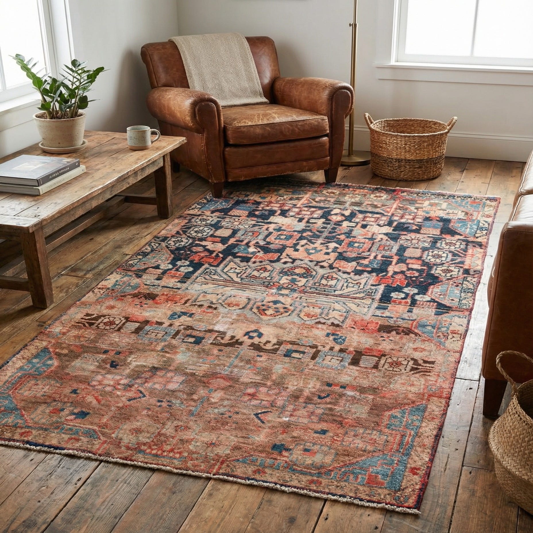 This Persian Ultra Vintage rug is an antique Persian Rug that has been washed, over-dyed, and then shaved down to a low pile. Look at the detail pictures to fully appreciate the uniqueness of this piece.