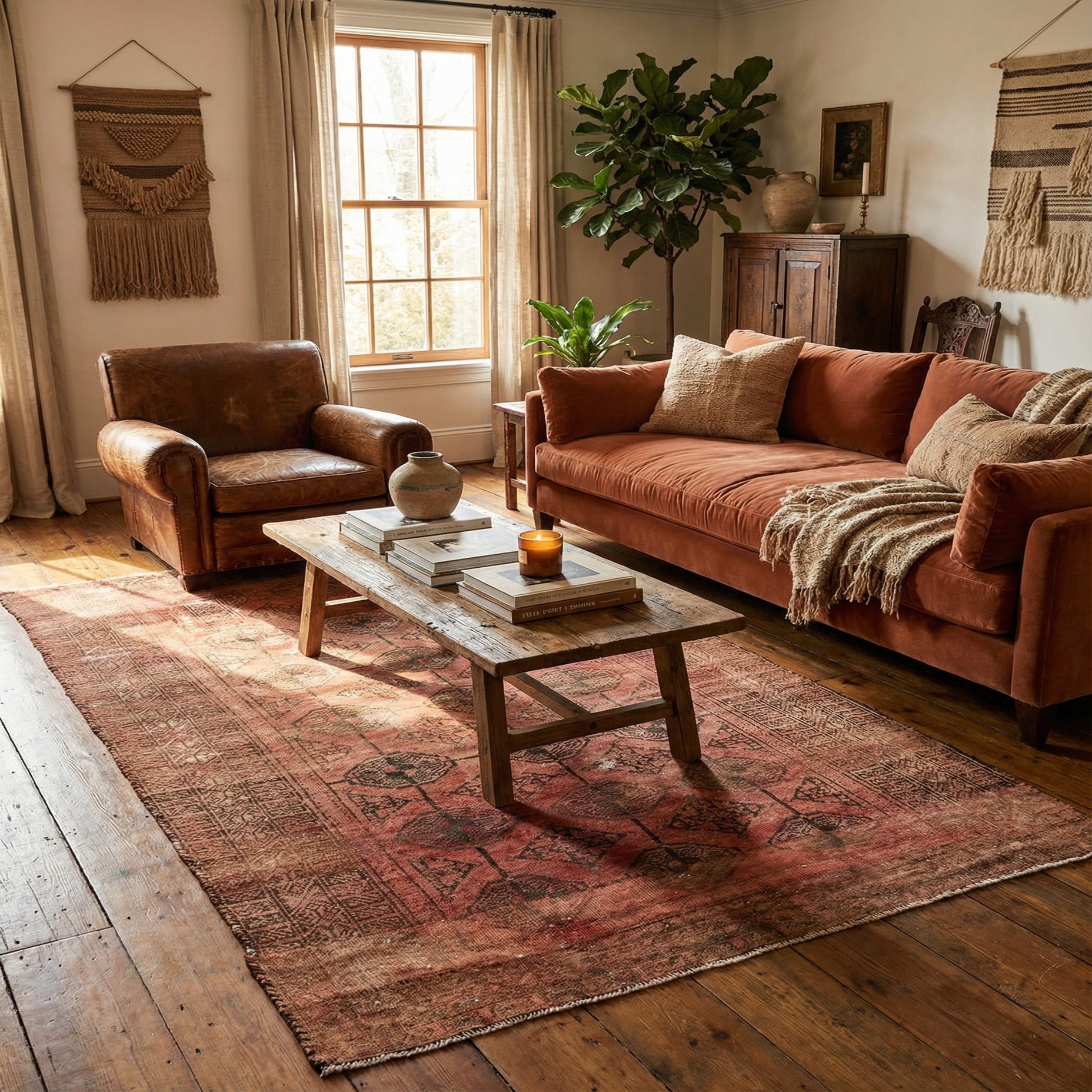 Primary color is Rust Red. Colors in this rug include: Rust Red, Brown, Black.