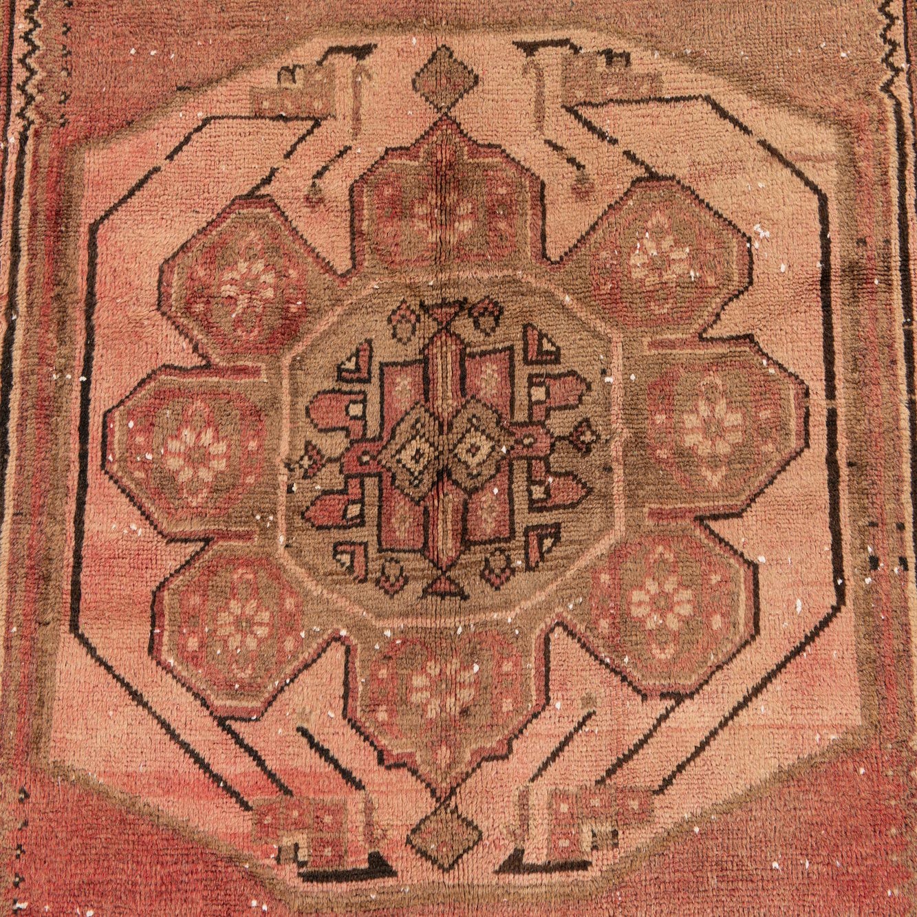 Primary color is Rust Red. Colors in this rug include: Rust Red, Brown, Beige.