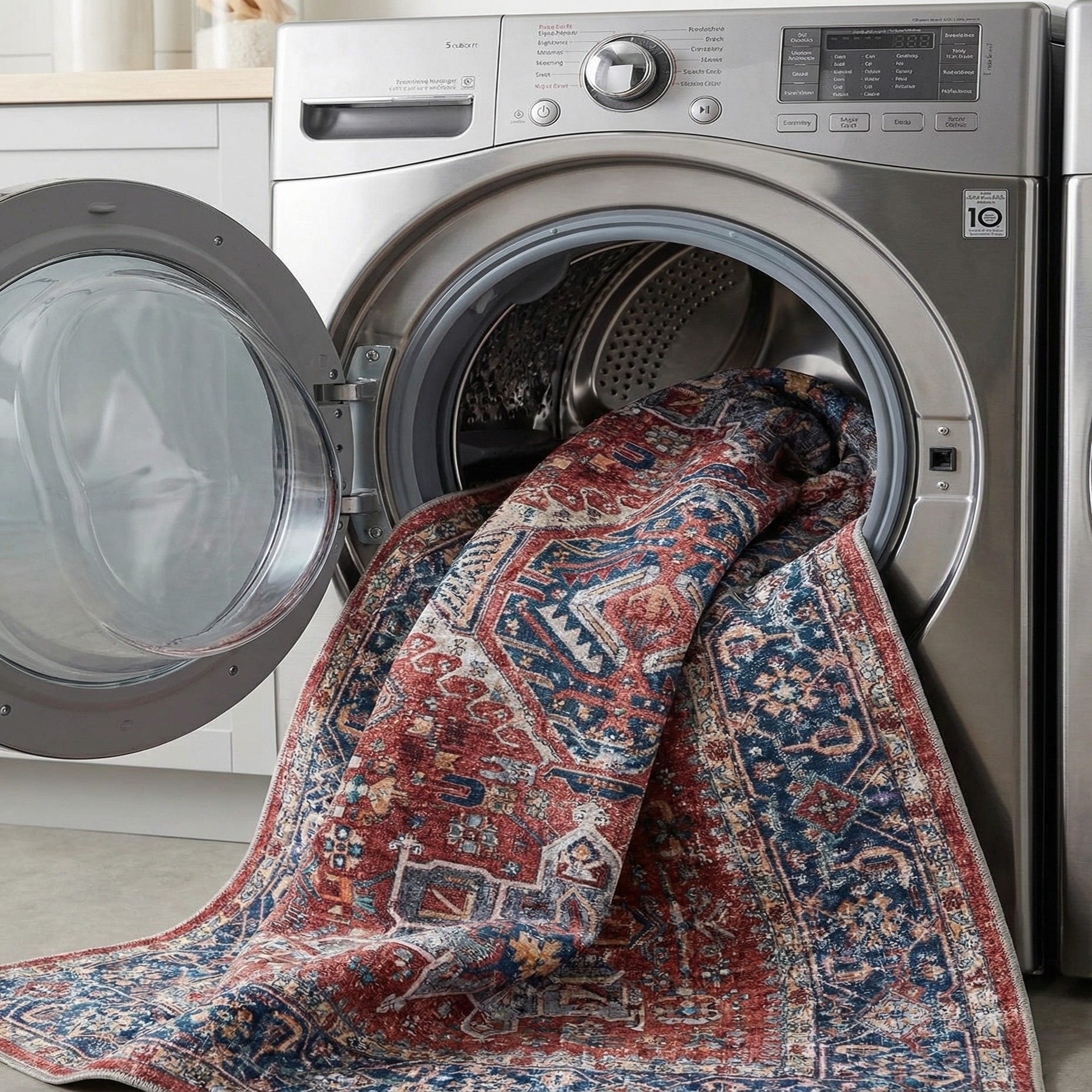 Primary color is Rust Red. Colors in this rug include: Rust Red, Blue, Gray, Ivory, Light Blue, Navy Blue.