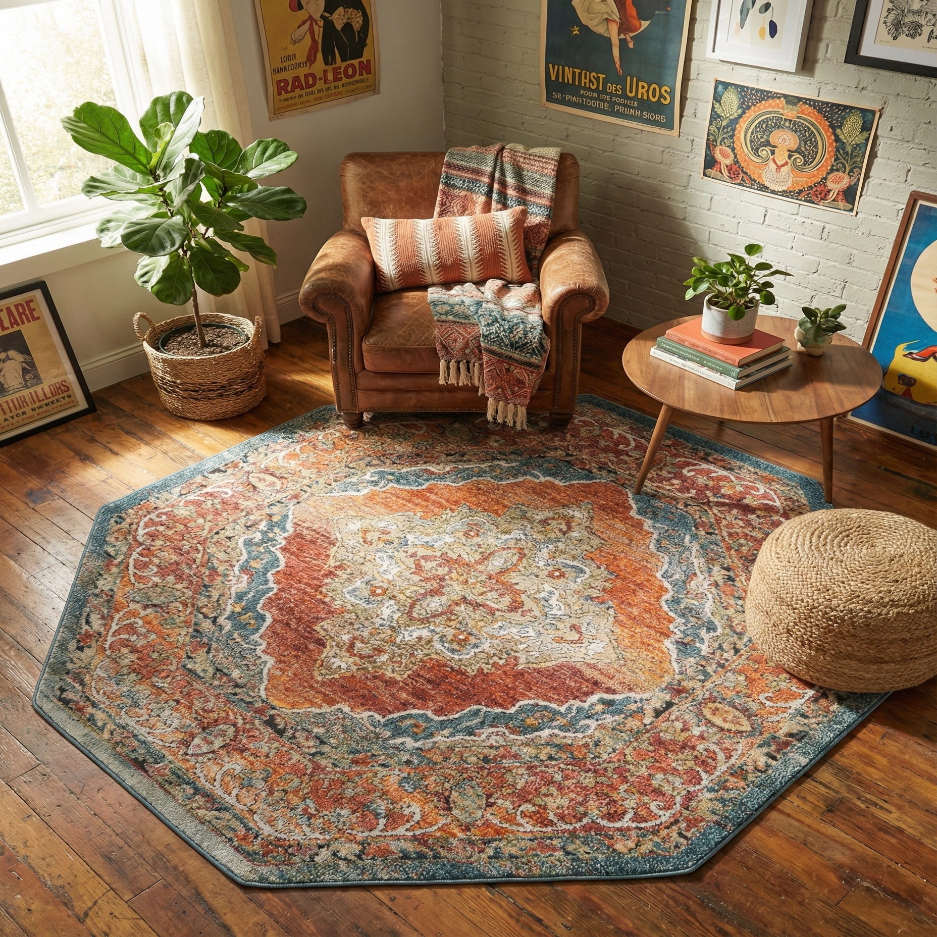 Primary color is Rust Red. Colors in this rug include: Rust Red, Beige, Blue, Brown, Green, Ivory, Orange, Light Brown.