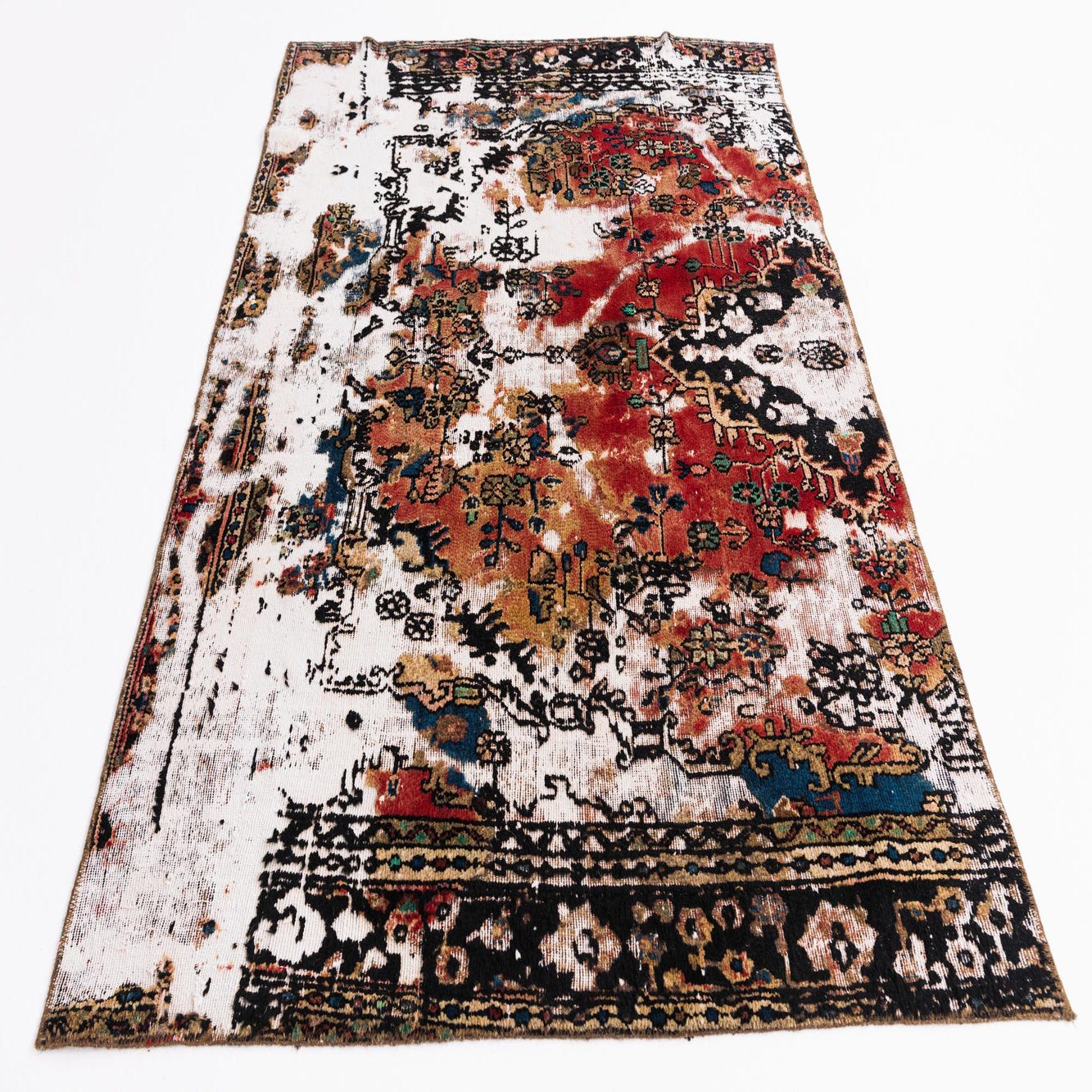 This Persian Ultra Vintage rug is an antique Persian Rug that has been washed, over-dyed, and then shaved down to a low pile. Look at the detail pictures to fully appreciate the uniqueness of this piece.