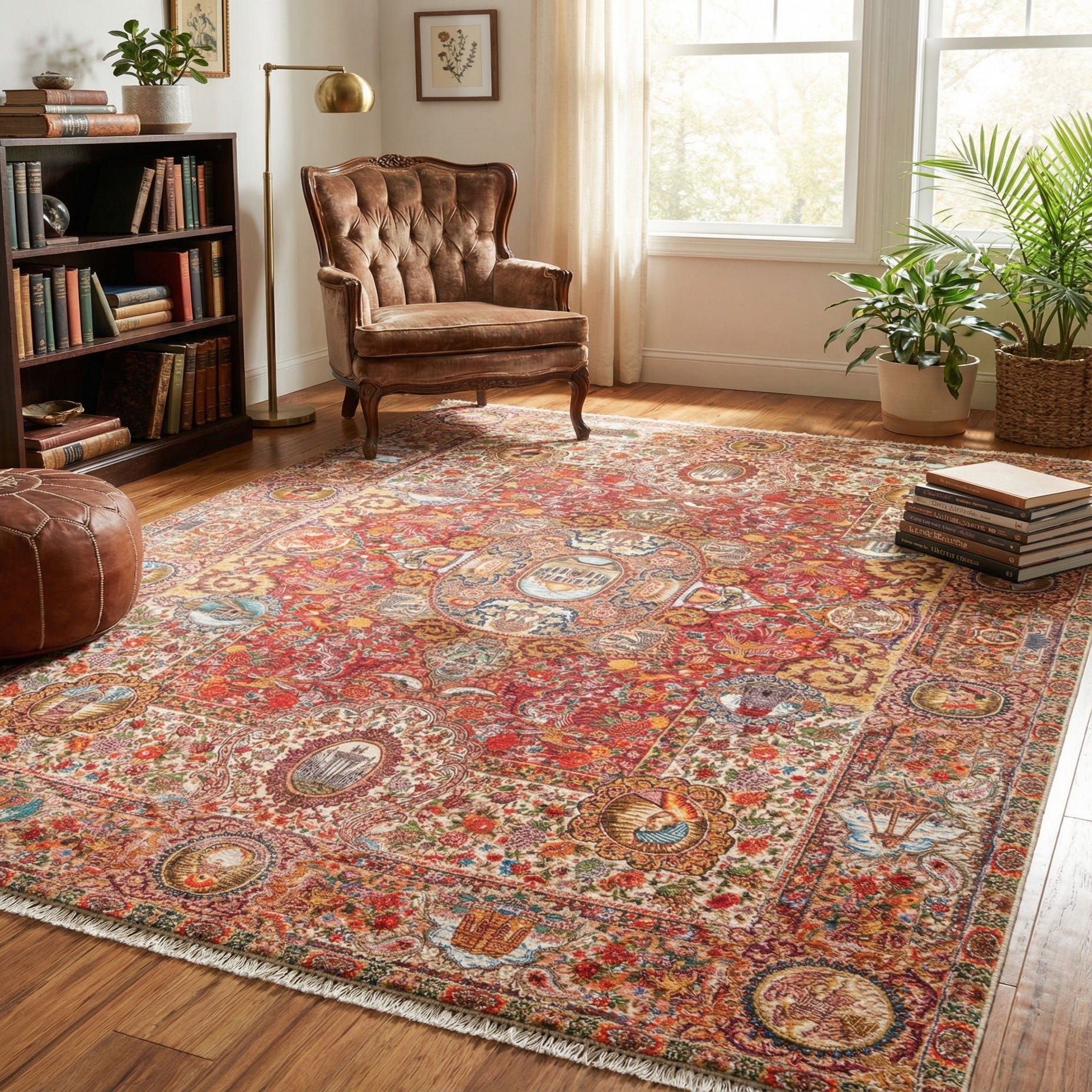 Primary color is Rust Red. Colors in this rug include: Rust Red, Brown, Burgundy, Ivory, Navy Blue, Olive, Orange, Peach, Red, Yellow, Light Green.