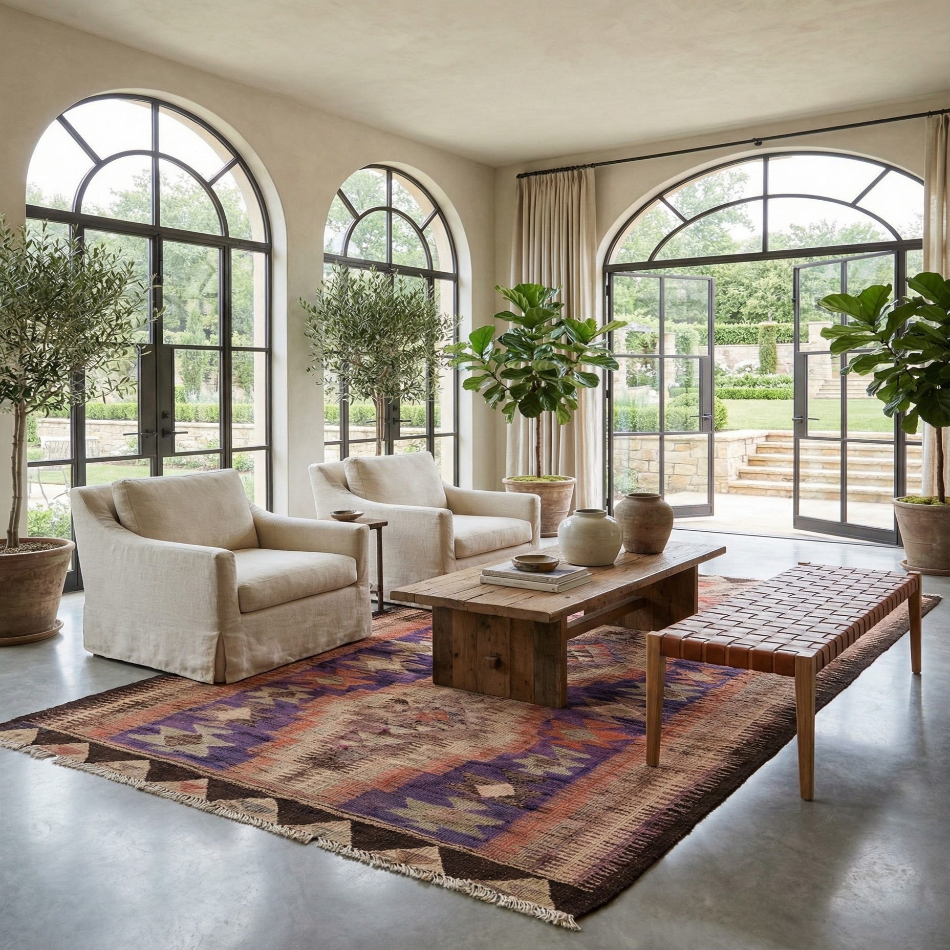 Primary color is Rust Red. Colors in this rug include: Rust Red, Brown, Violet, Ivory.