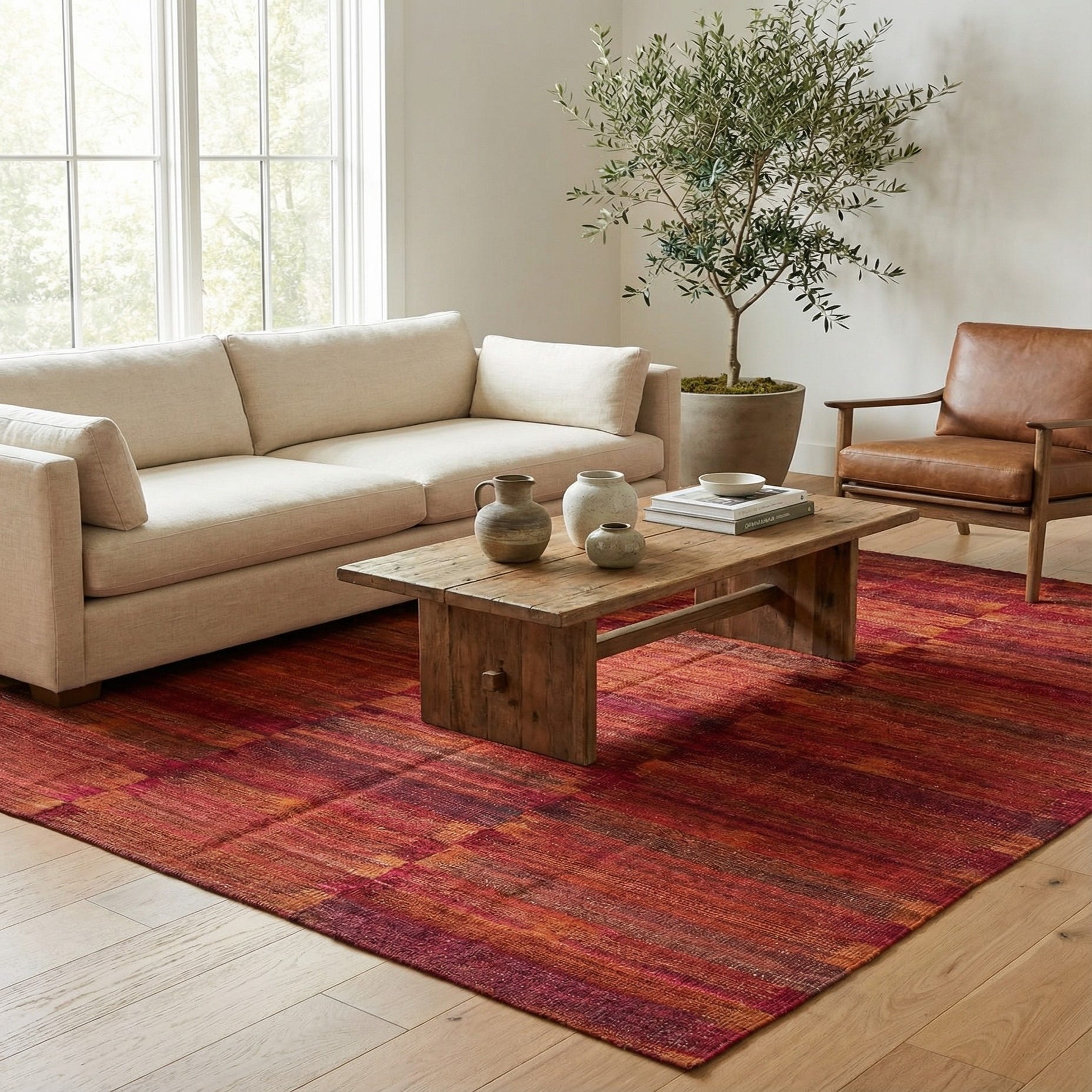 Primary color is Rust Red. Colors in this rug include: Rust Red, Burgundy, Orange, Red.