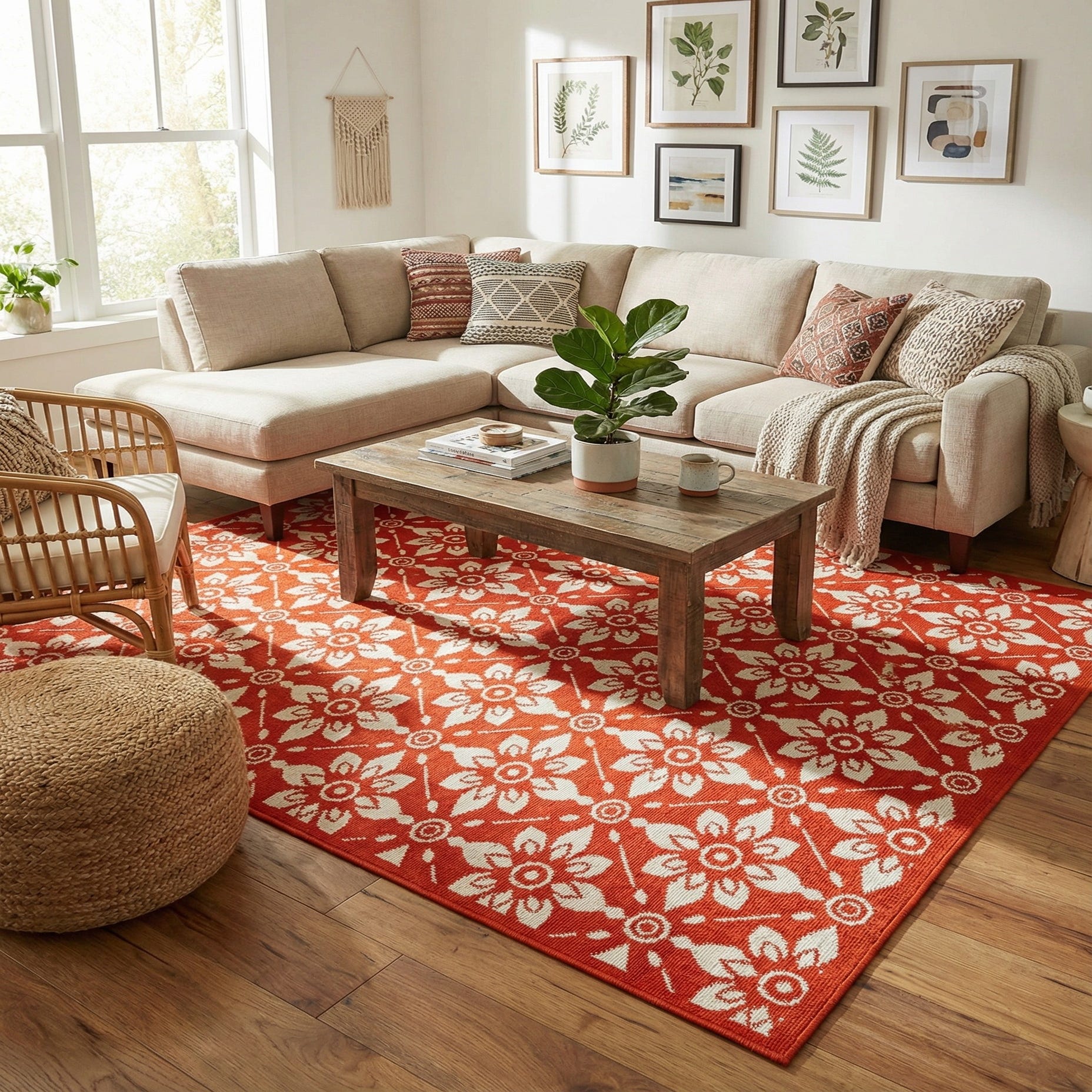 Primary color is Rust Red. Colors in this rug include: Rust Red, Ivory.
