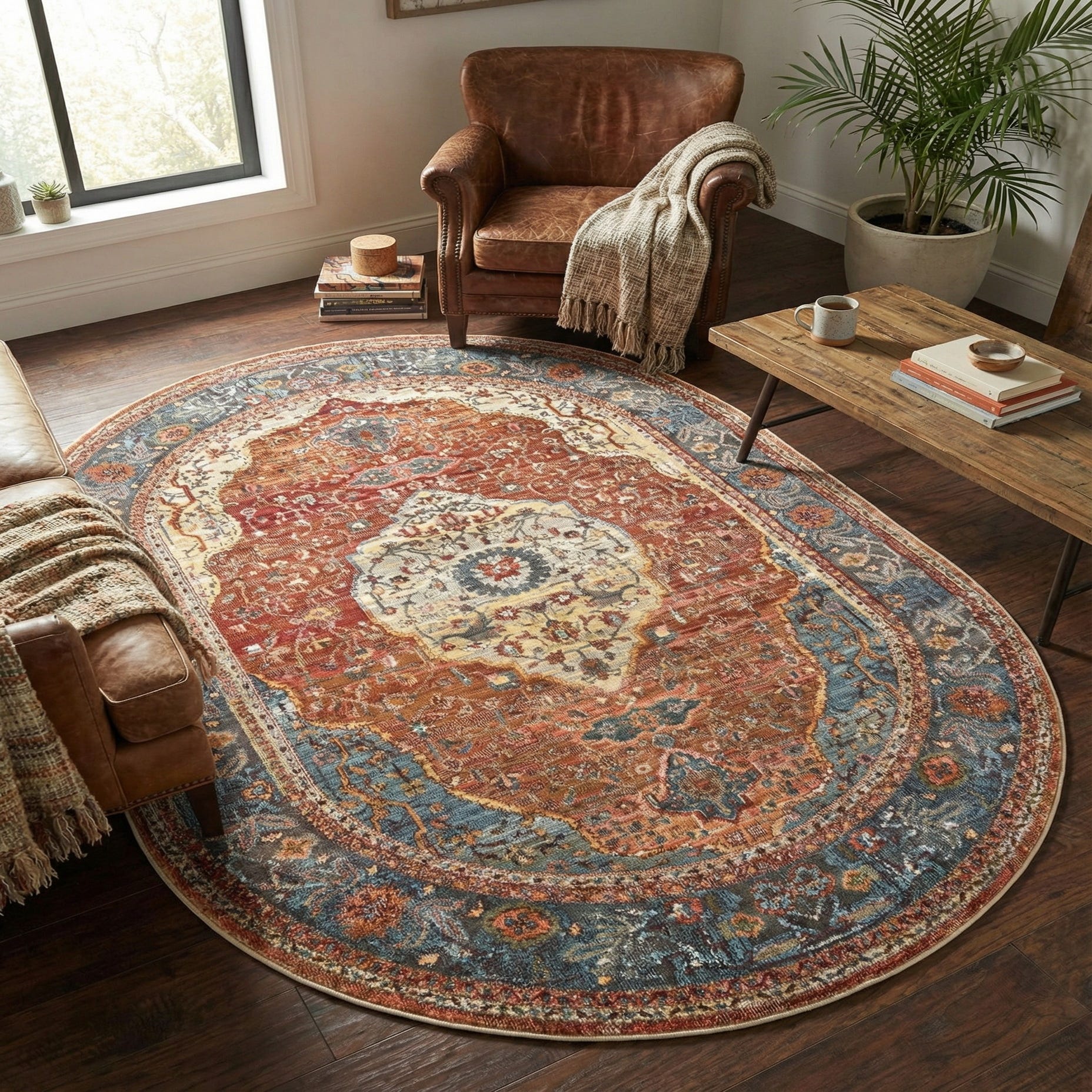 Primary color is Rust Red. Colors in this rug include: Rust Red, Blue, Ivory, Light Blue, Orange, Tan, Peach.