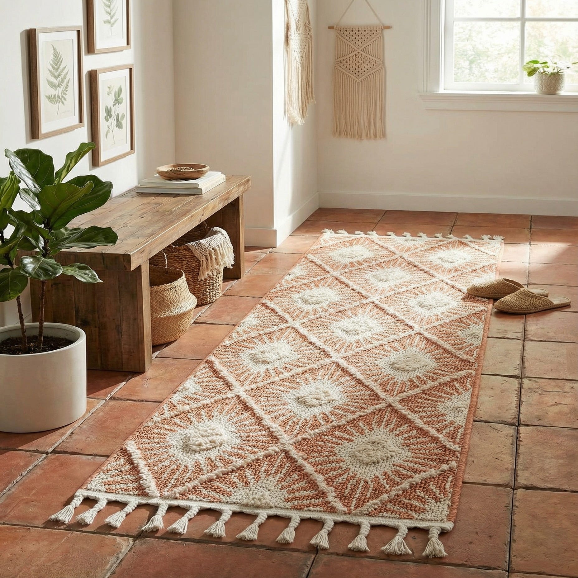 Primary color is Rust Red. Colors in this rug include: Rust Red, Ivory.