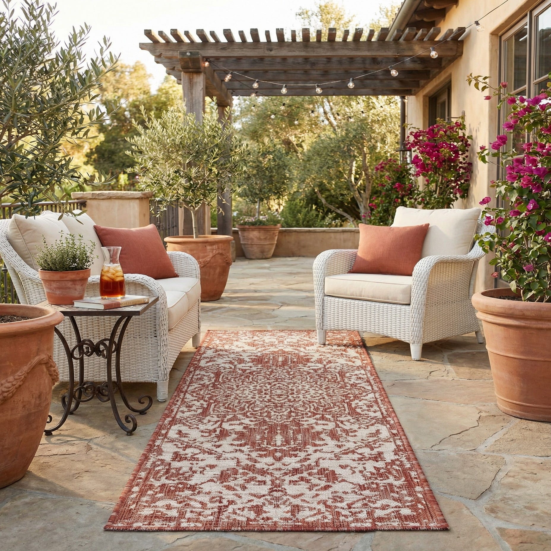 Primary color is Rust Red. Colors in this rug include: Rust Red, Ivory.
