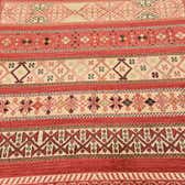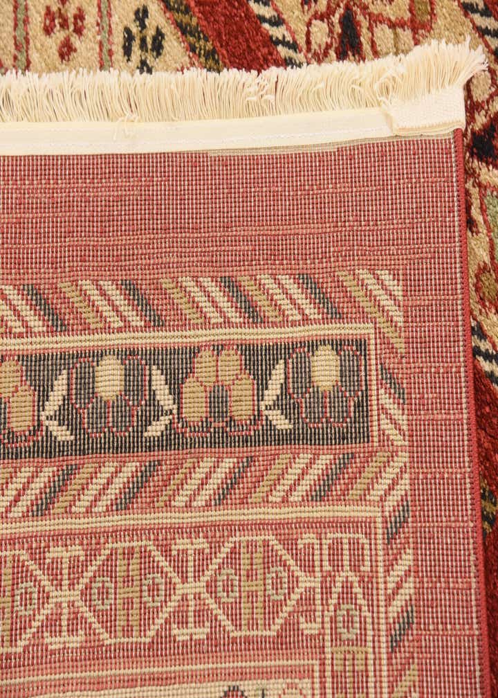 Primary color is Rust Red. Colors in this rug include: Rust Red, Black, Cream, Light Blue, Red, Olive, Gold.