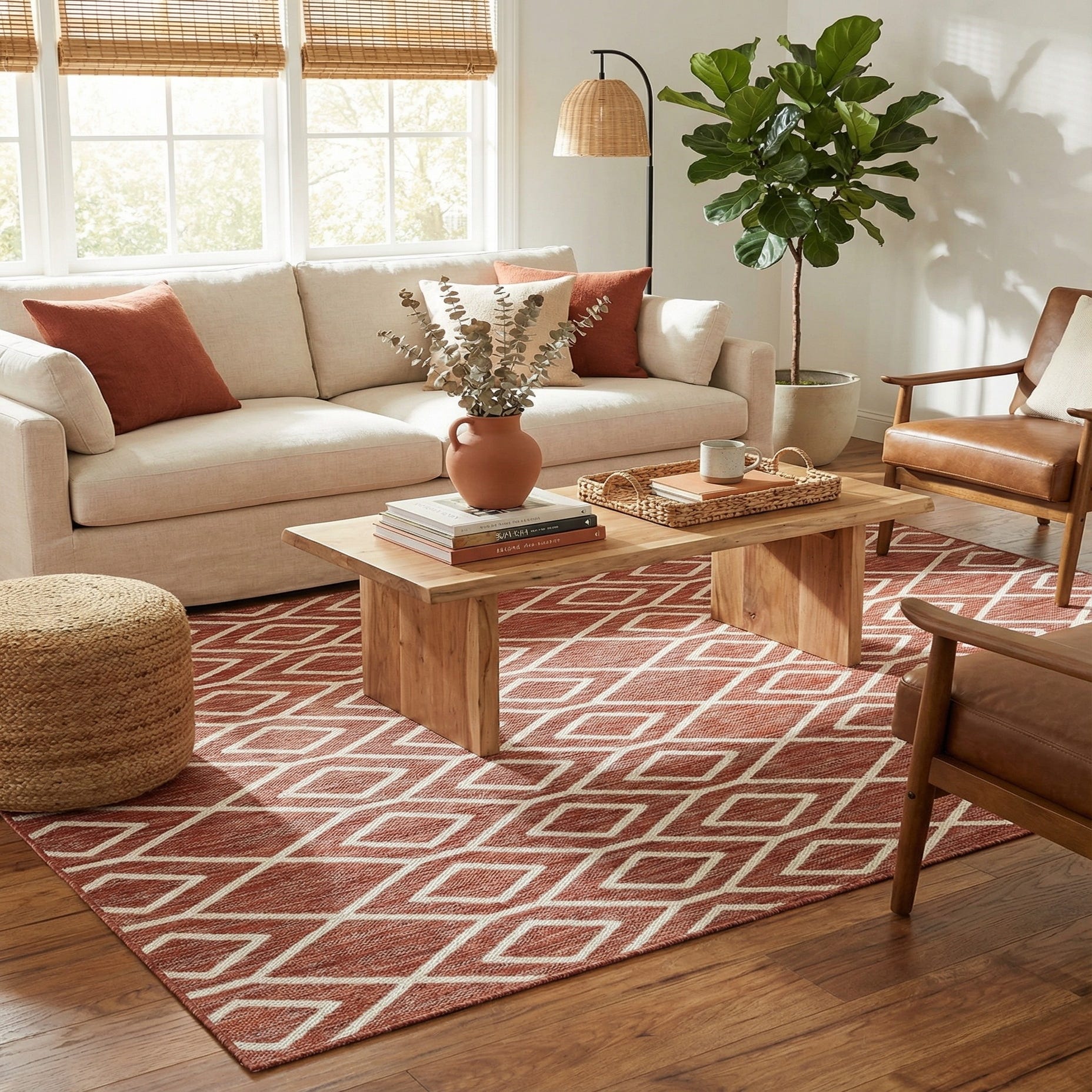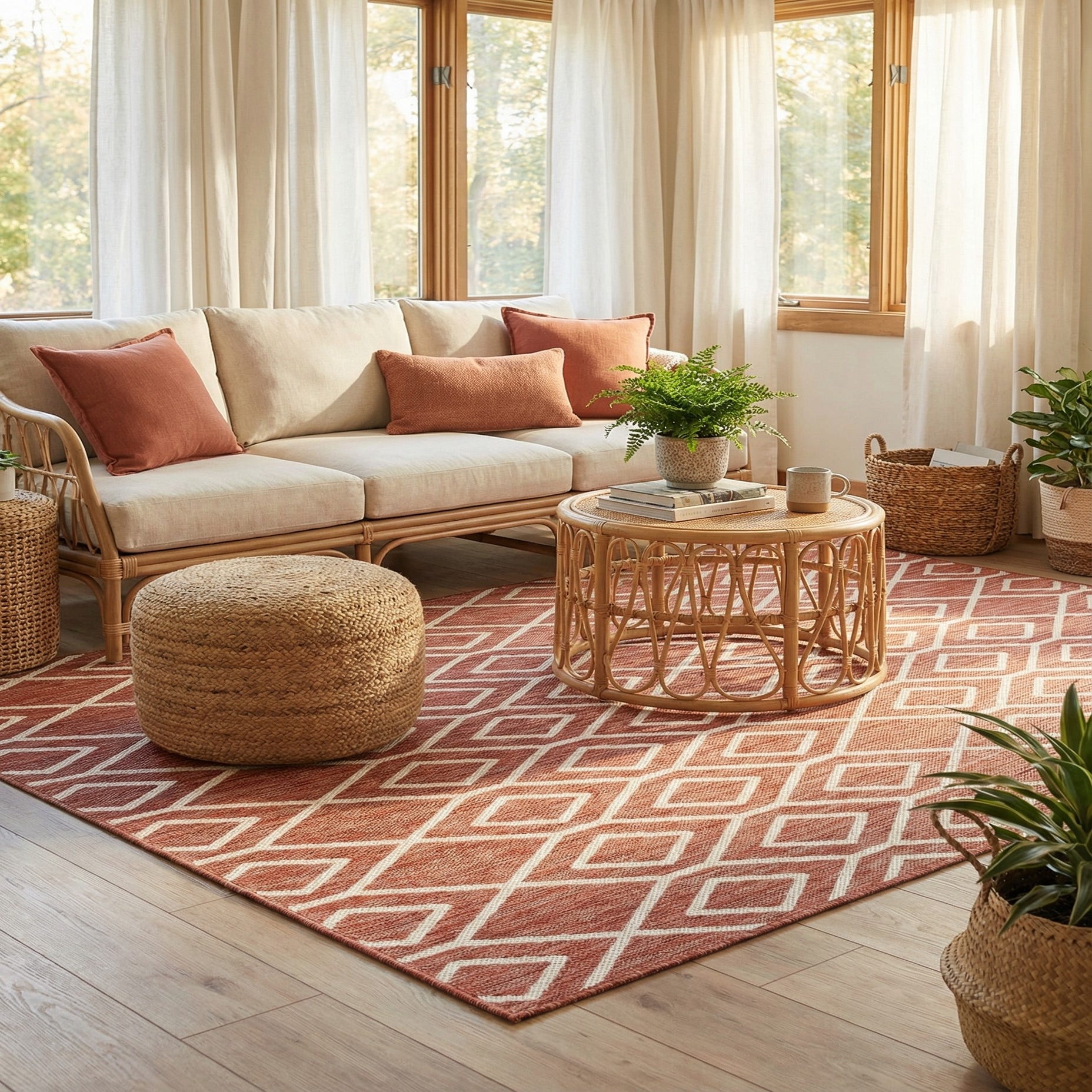 Primary color is Rust Red. Colors in this rug include: Rust Red, Ivory.
