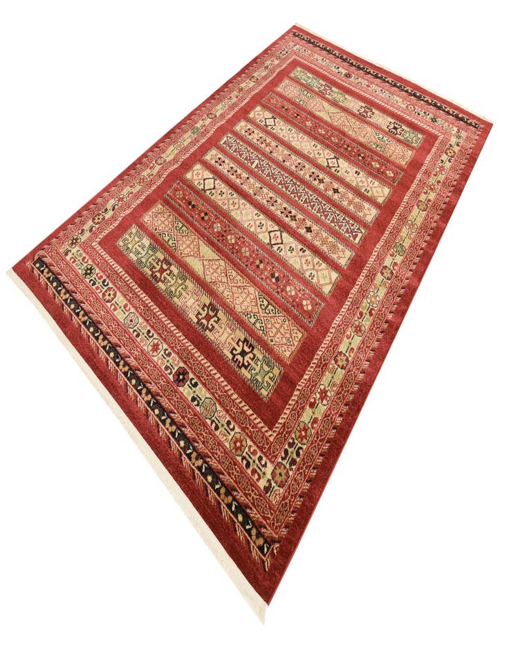 Primary color is Rust Red. Colors in this rug include: Rust Red, Beige, Black, Light Blue, Light Brown, Light Green.
