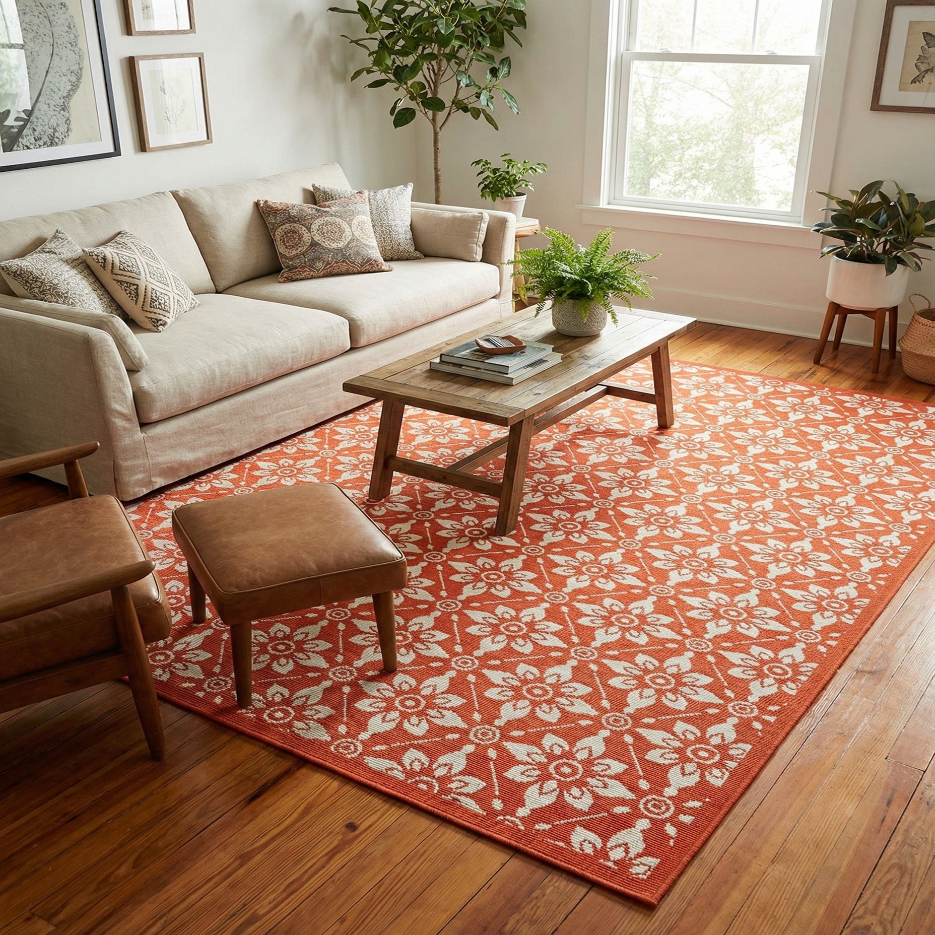 Primary color is Rust Red. Colors in this rug include: Rust Red, Ivory.