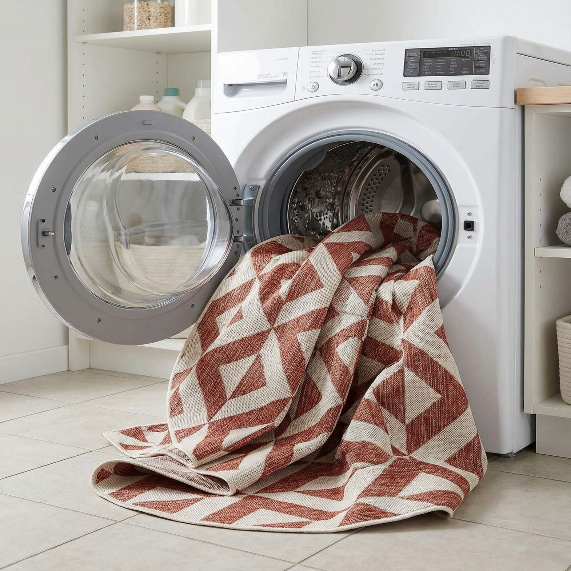 Primary color is Rust Red. Colors in this rug include: Rust Red, Ivory.