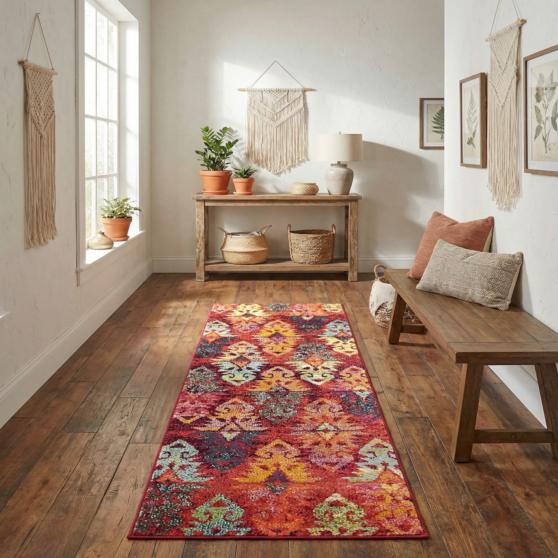 Primary color is Rust Red. Colors in this rug include: Rust Red, Black, Green, Orange, Red, Light Blue, Yellow, Violet, Pink.