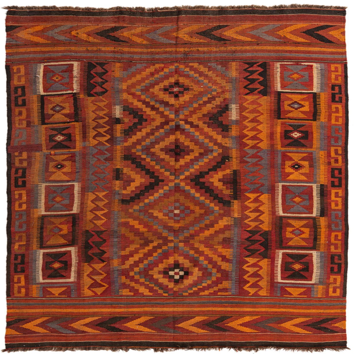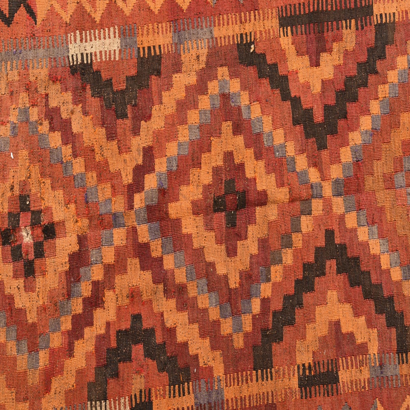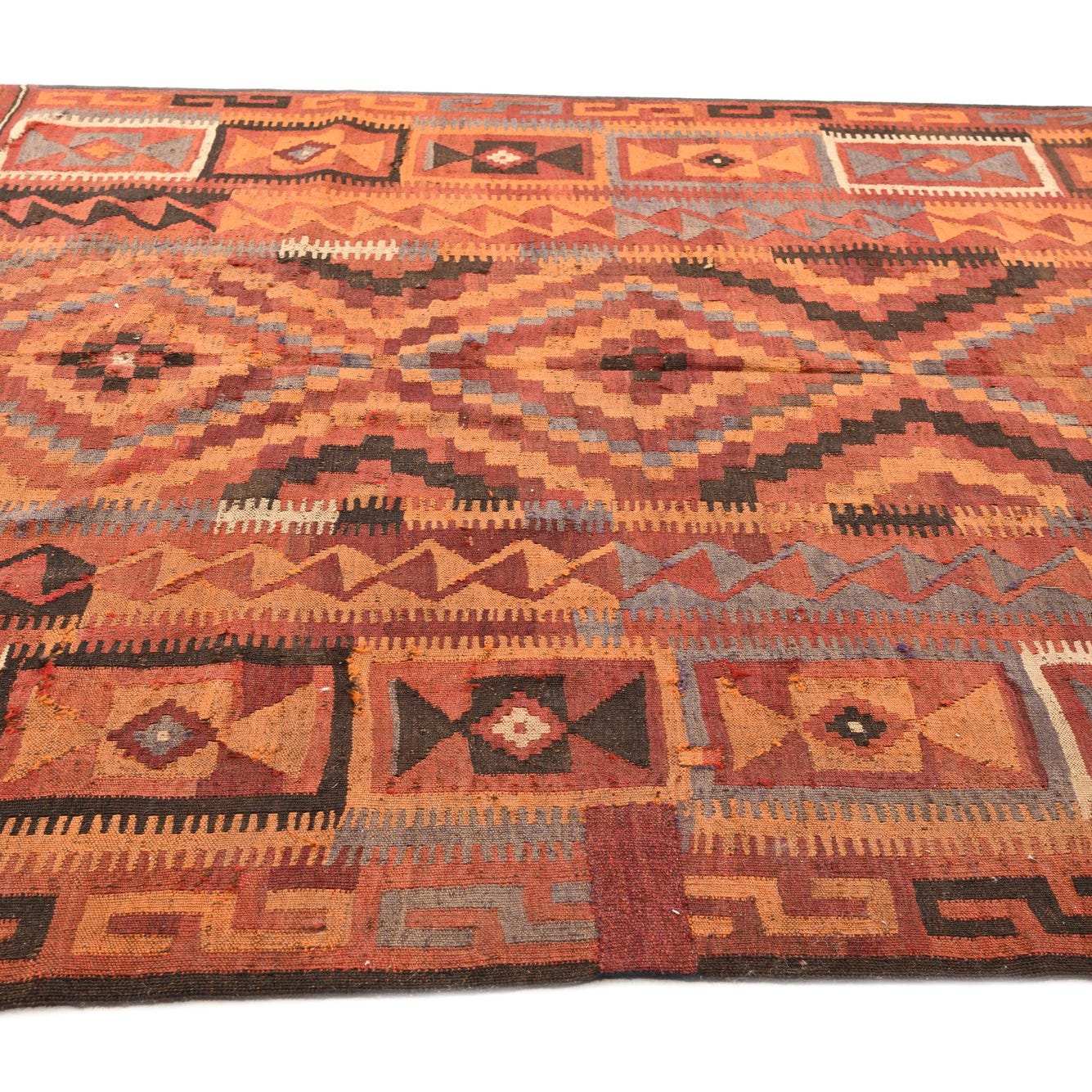 Primary color is Rust Red. Colors in this rug include: Rust Red, Black, Brown, Ivory, Orange, Tan, Terracotta.