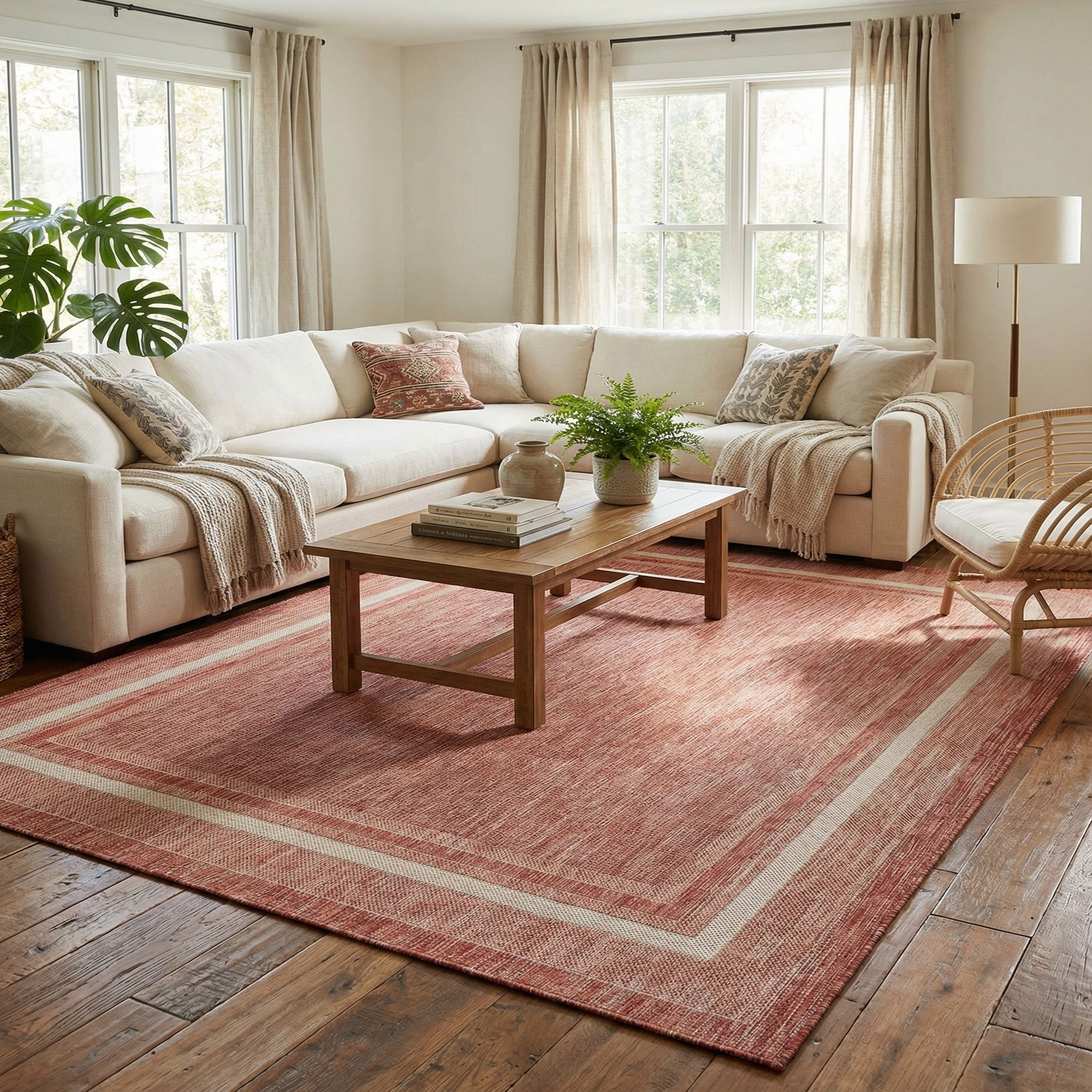 Primary color is Rust Red. Colors in this rug include: Rust Red, Beige.