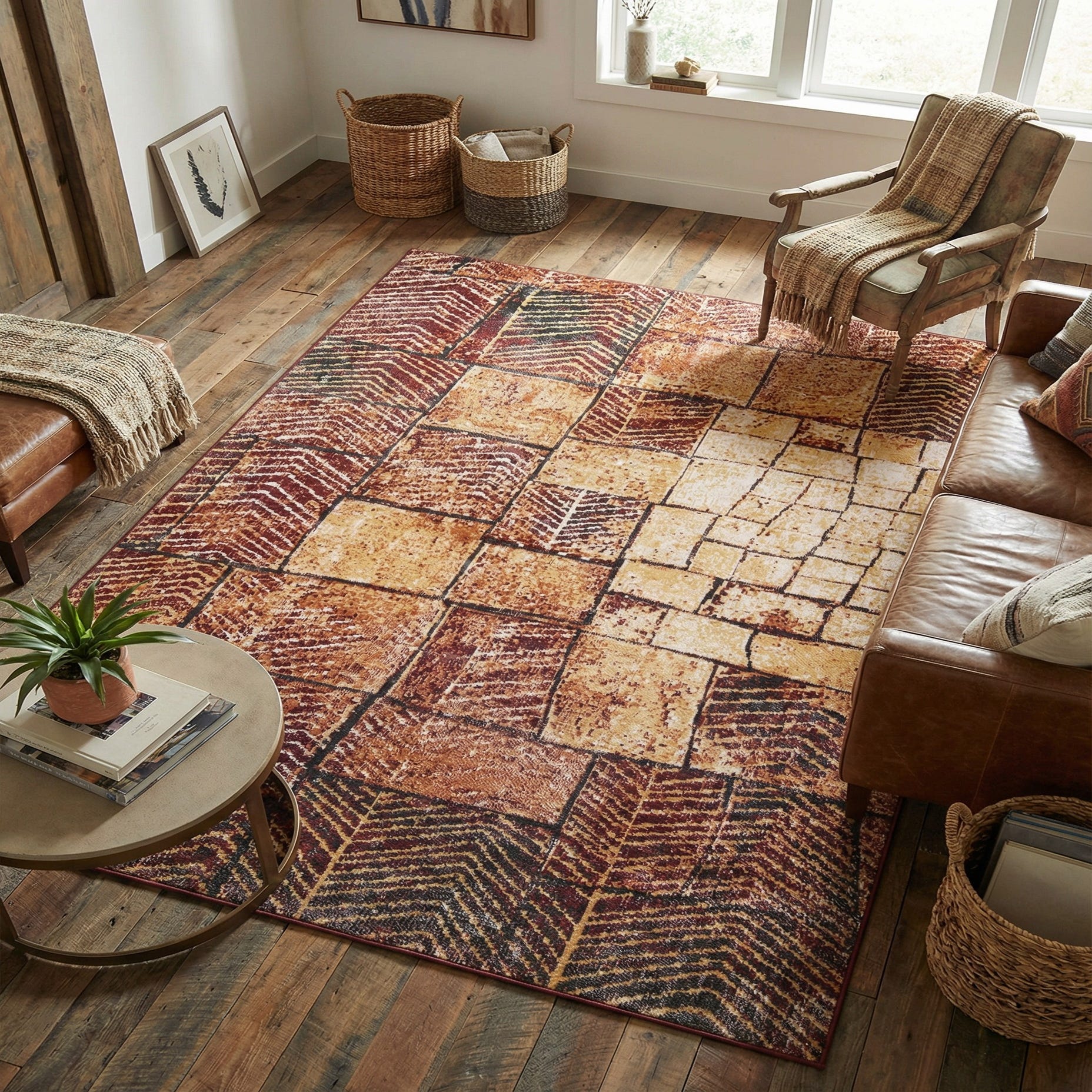Primary color is Rust Red. Colors in this rug include: Rust Red, Brown, Gold, Ivory, Orange.