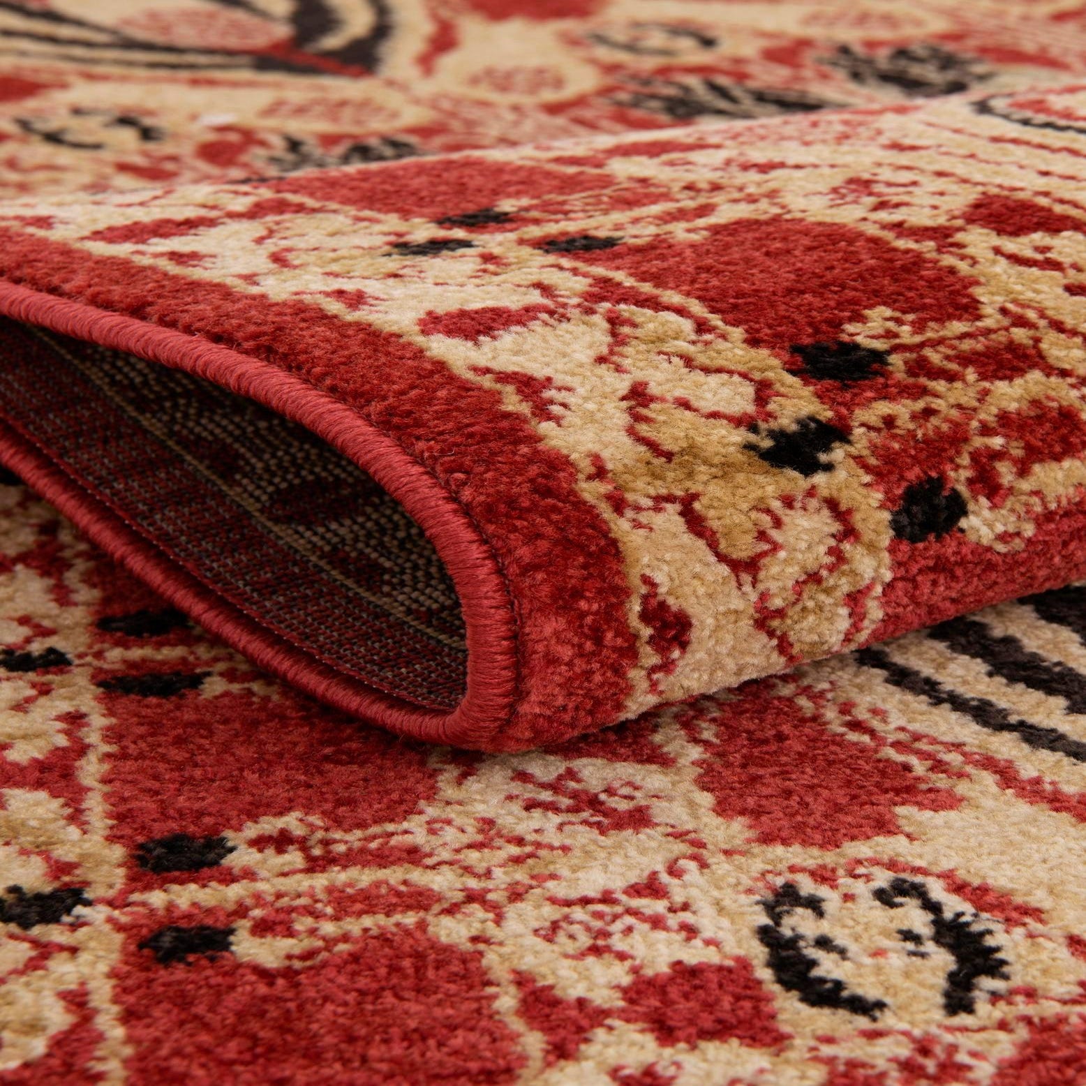 Primary color is Rust Red. Colors in this rug include: Rust Red, Beige, Black, Red, Olive, Light Green.