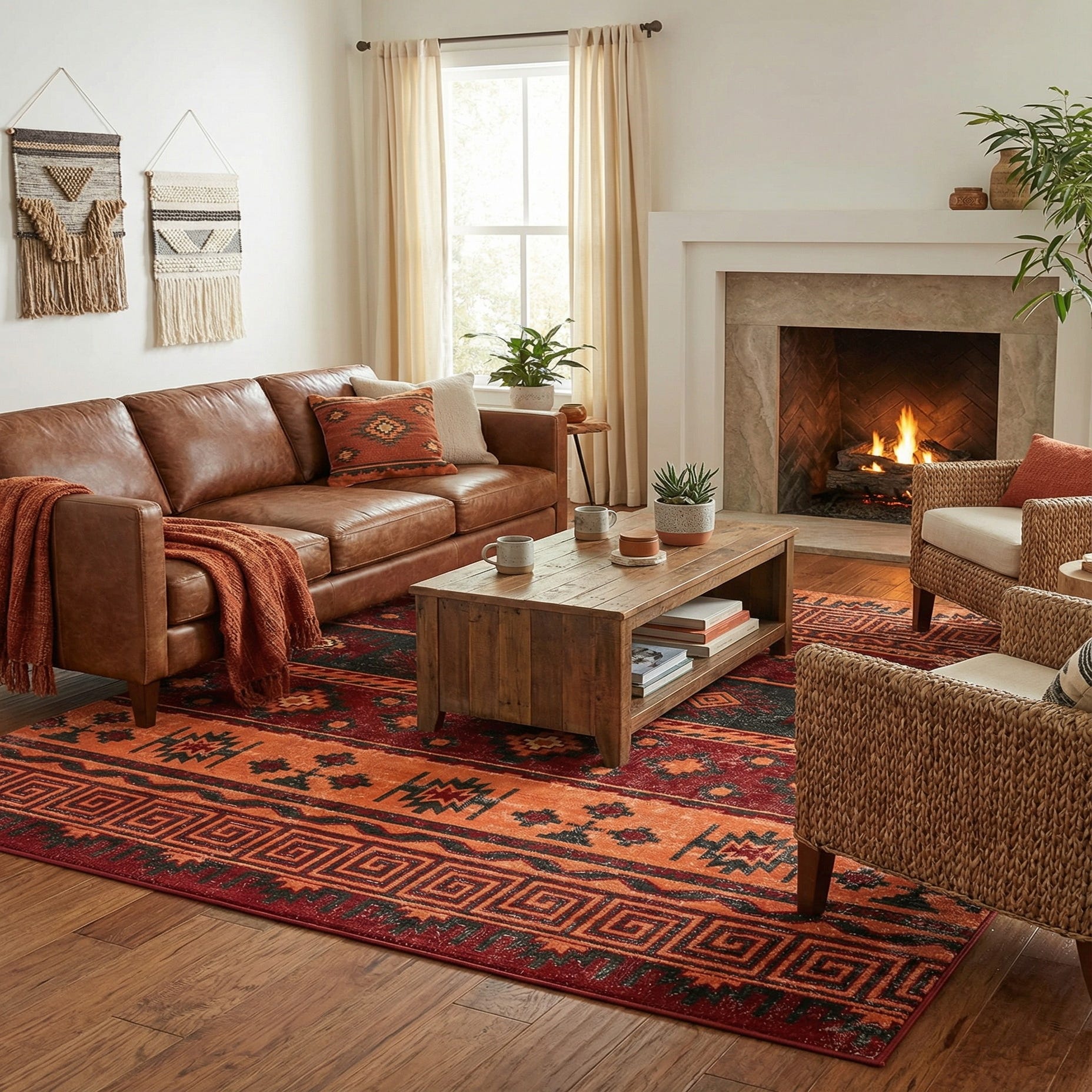 Primary color is Rust Red. Colors in this rug include: Rust Red, Black, Ivory, Orange.