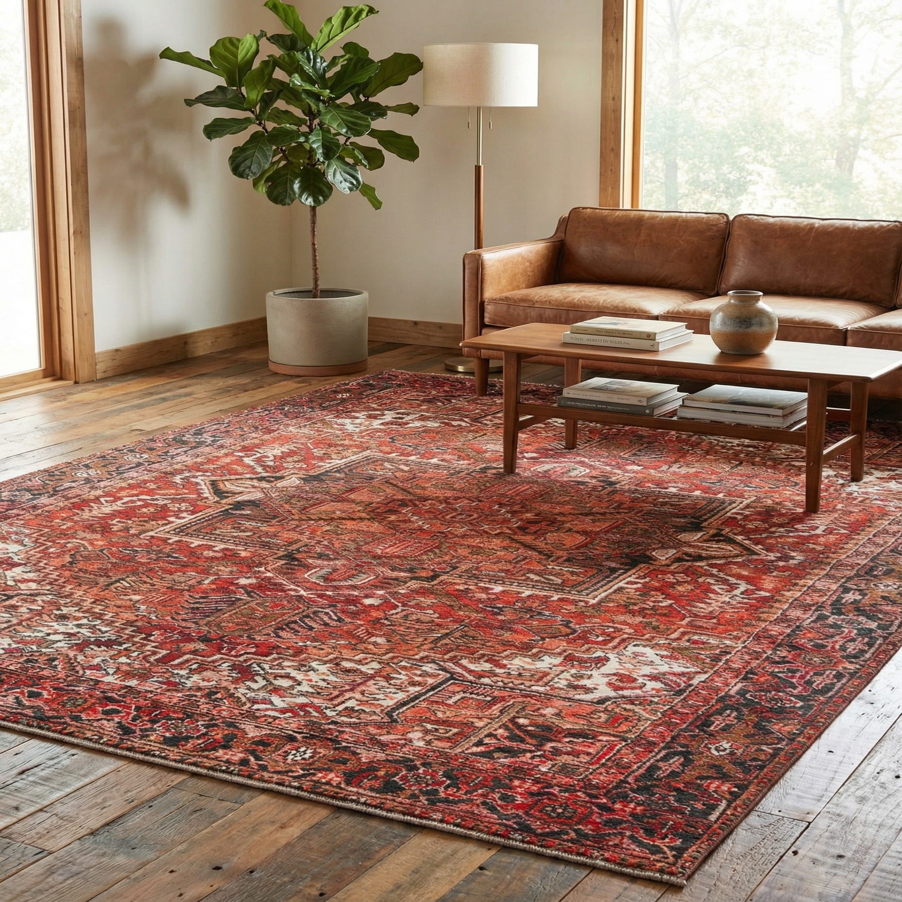 Primary color is Rust Red. Colors in this rug include: Rust Red, Black, Brown, Ivory, Peach.