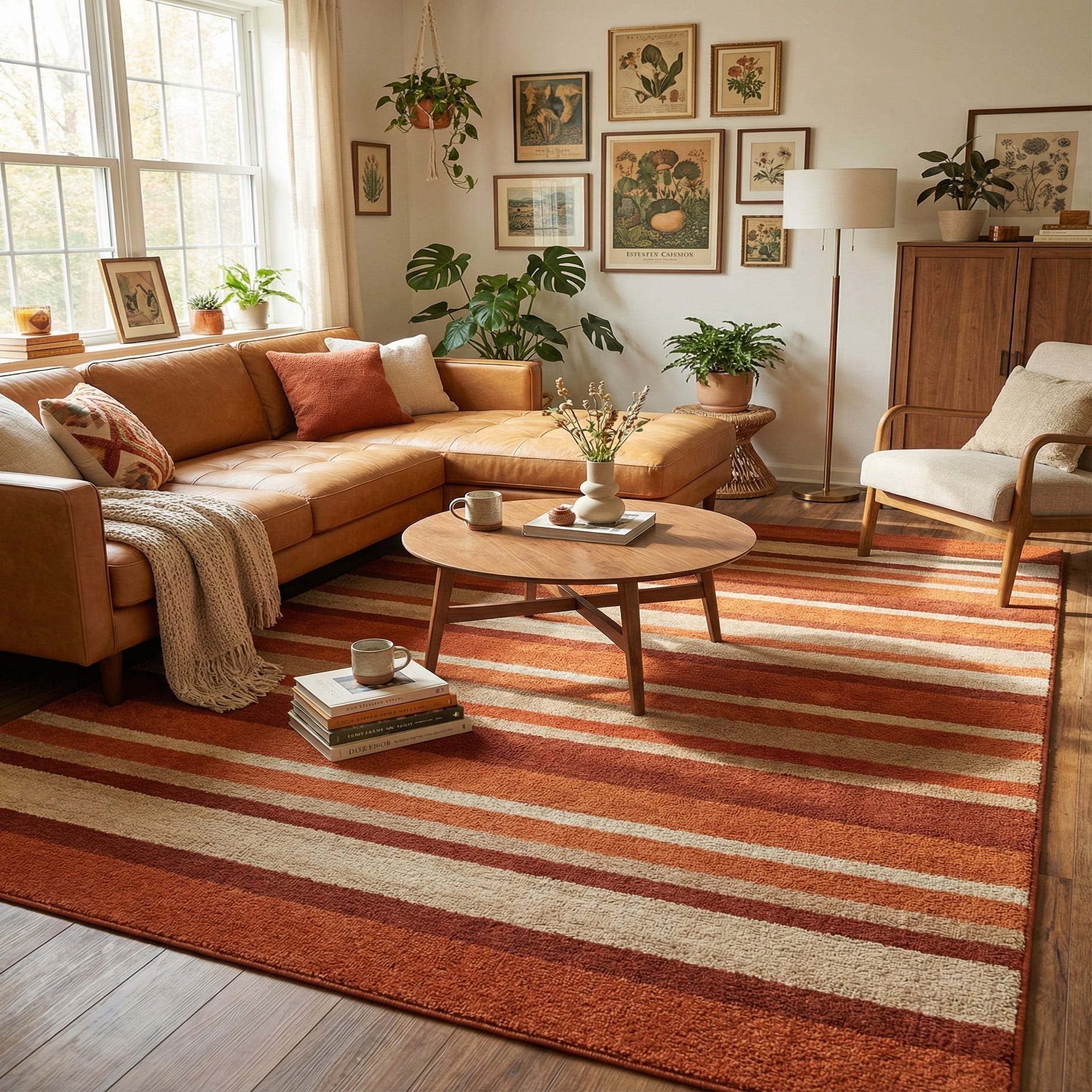 Primary color is Rust Red. Colors in this rug include: Rust Red, Beige, Burgundy, Terracotta.