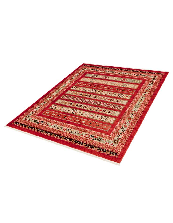 Primary color is Rust Red. Colors in this rug include: Rust Red, Beige, Black, Light Blue, Light Brown, Light Green.