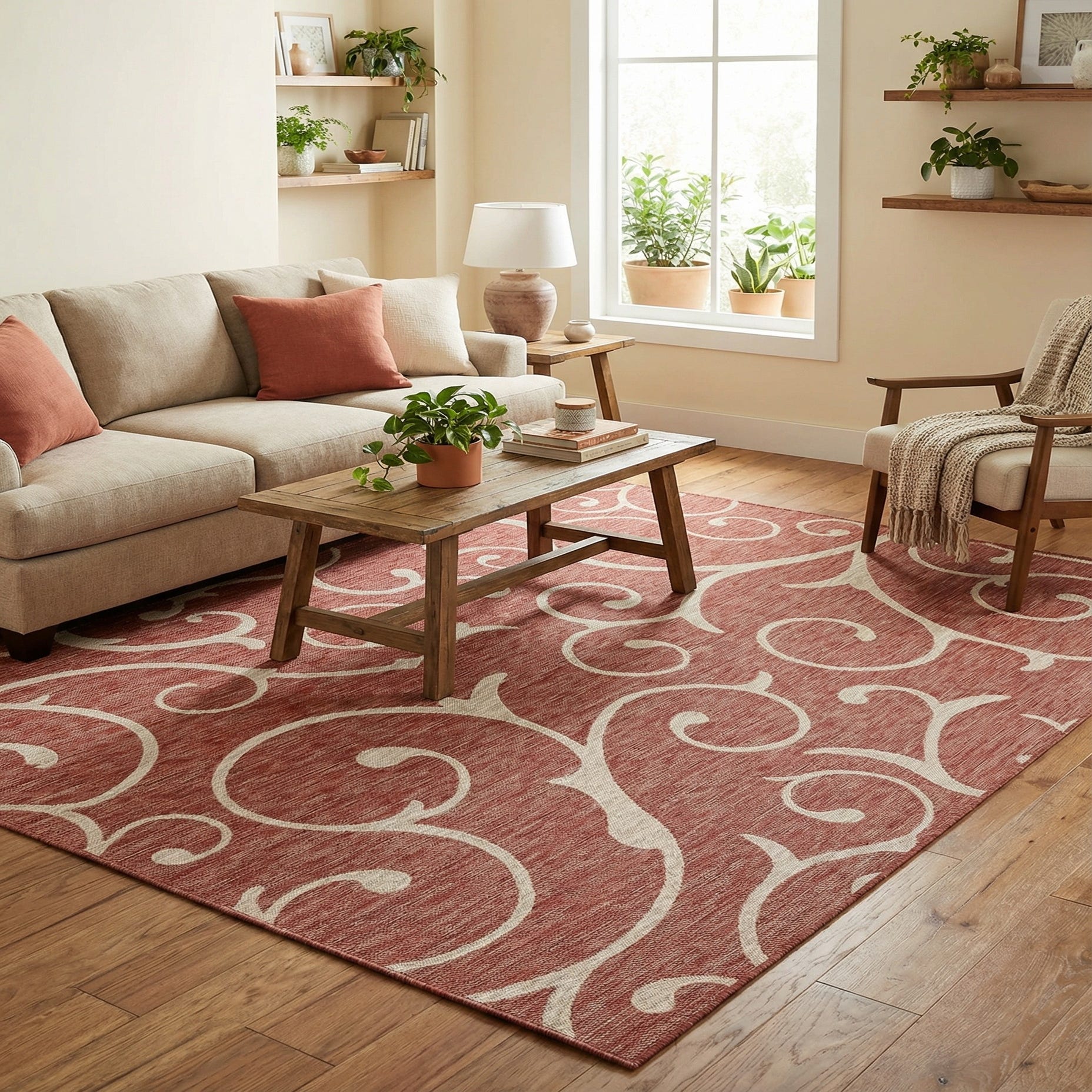 Primary color is Rust Red. Colors in this rug include: Rust Red, Gray.