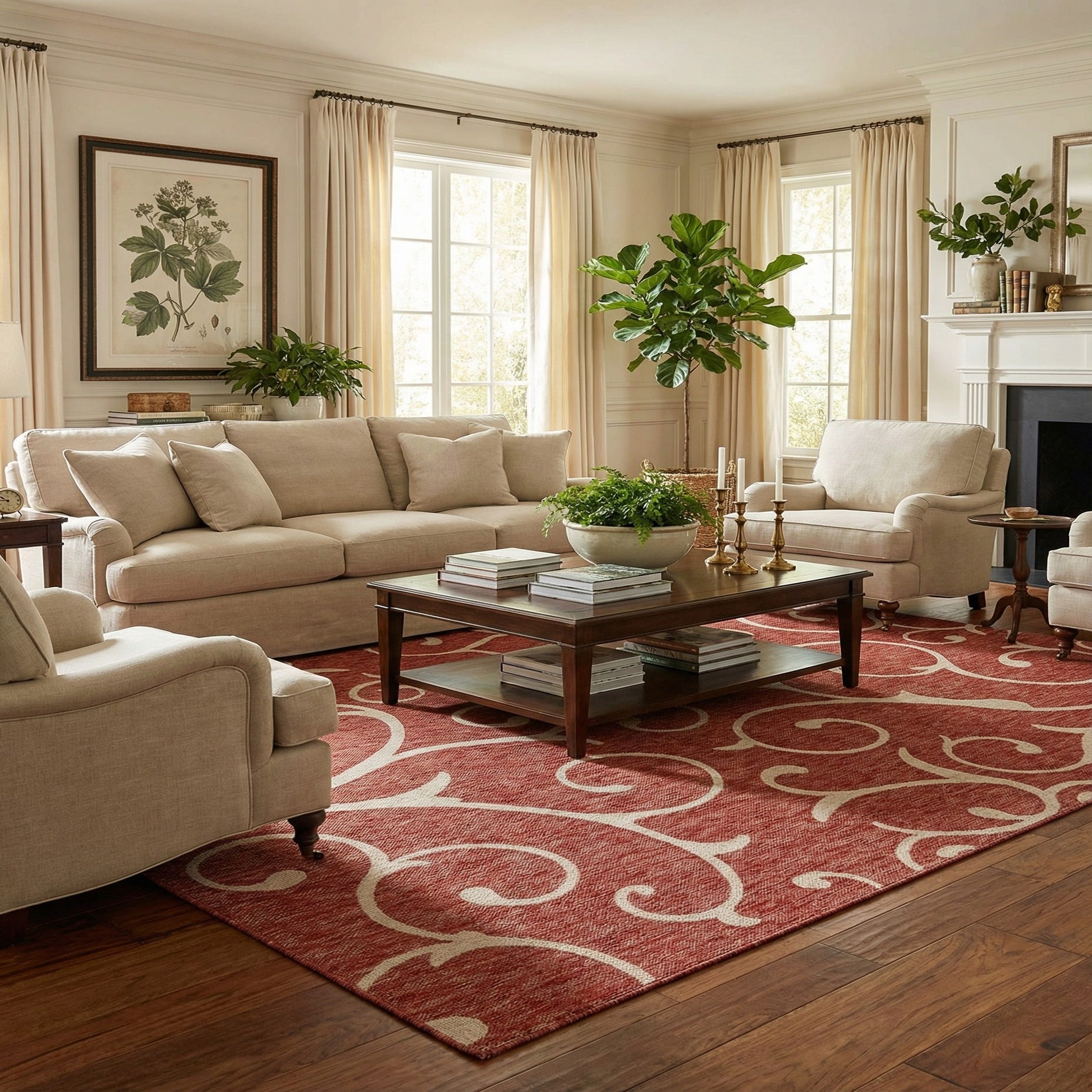 Primary color is Rust Red. Colors in this rug include: Rust Red, Gray.