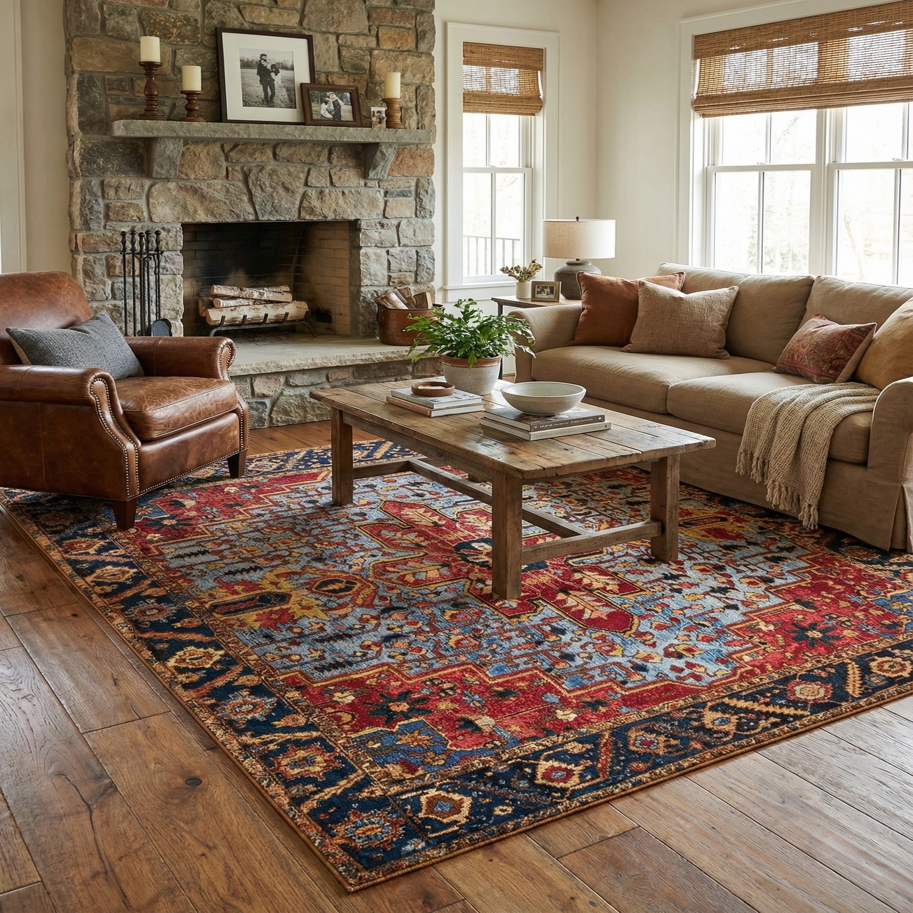 Primary color is Rust Red and Blue. Colors in this rug include: Rust Red and Blue, Navy Blue, Yellow, Ivory, Brown.