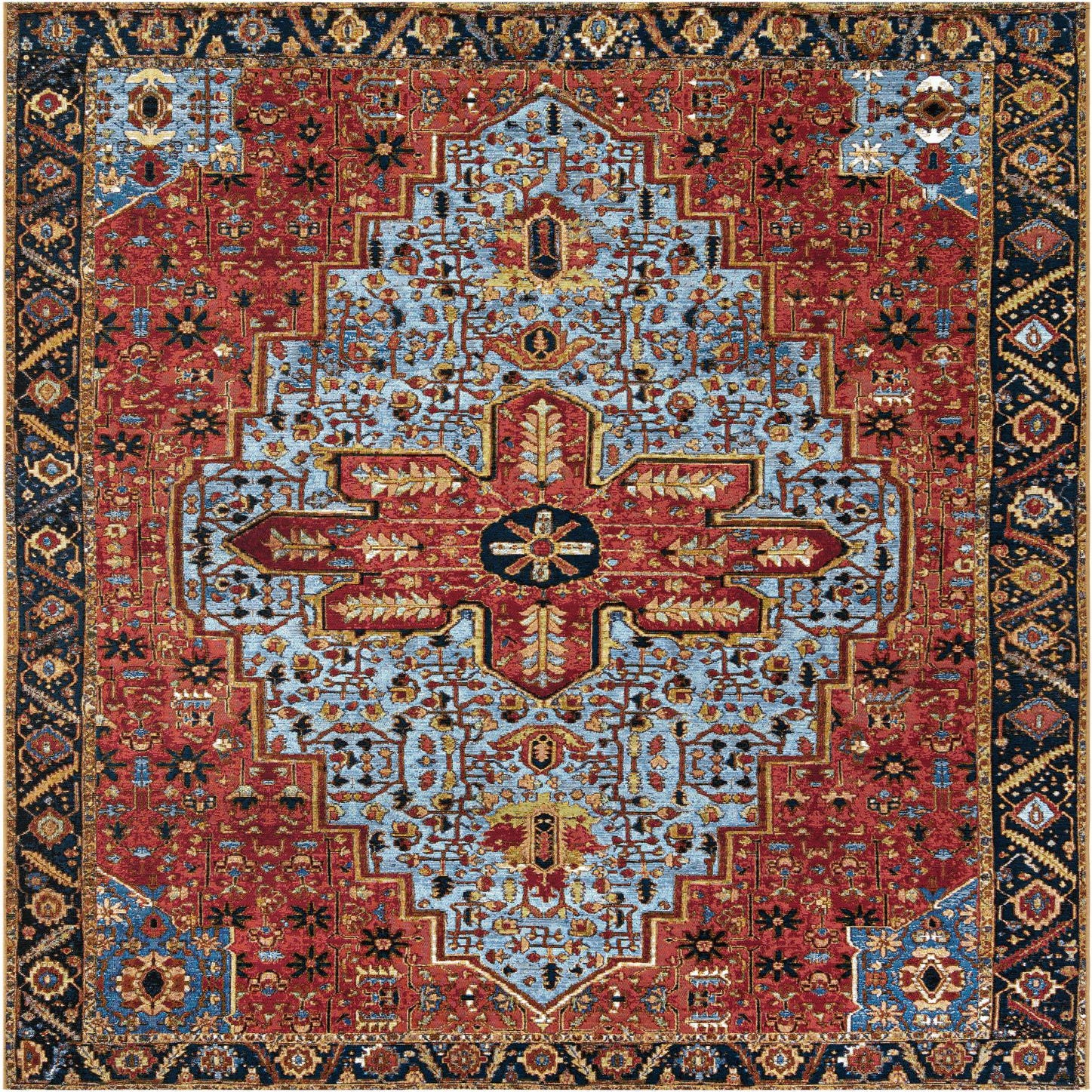 Primary color is Rust Red and Blue. Colors in this rug include: Rust Red and Blue, Ivory, Navy Blue, Yellow, Brown.