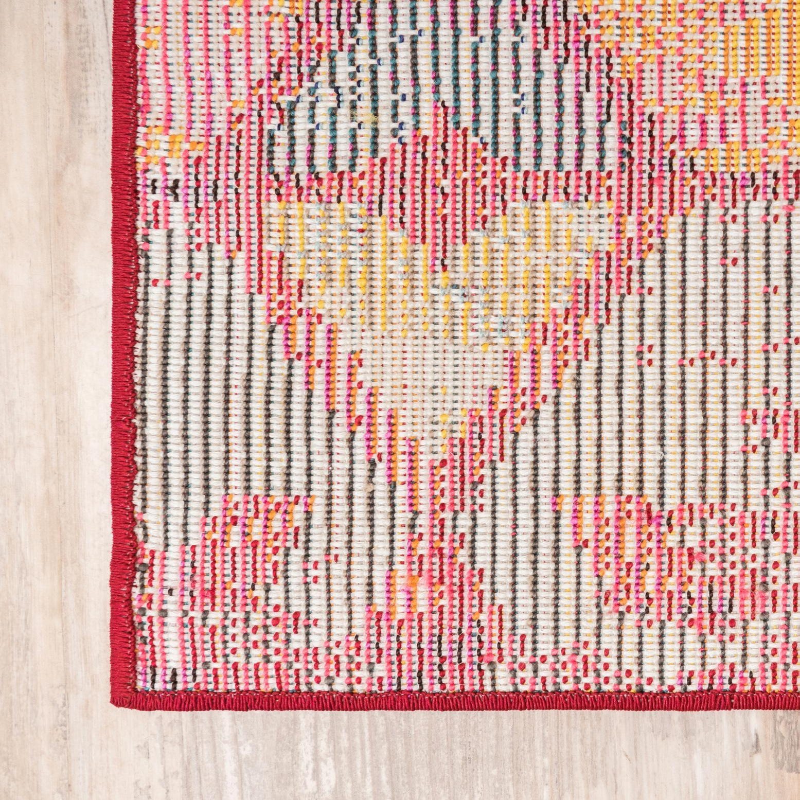 Primary color is Rust Red. Colors in this rug include: Rust Red, Black, Green, Orange, Red, Light Blue, Yellow, Violet, Pink.