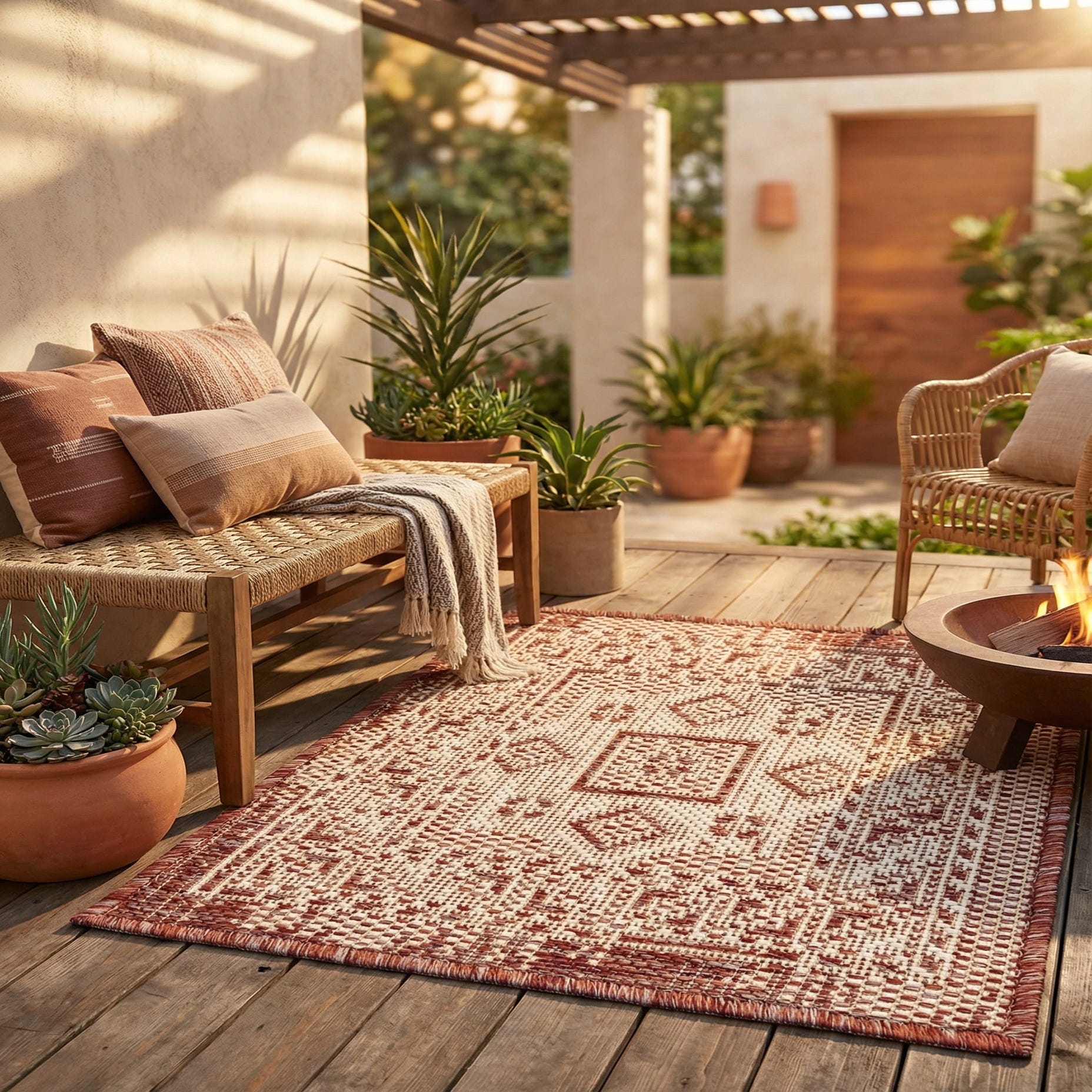 Primary color is Rust Red. Colors in this rug include: Rust Red, Ivory.