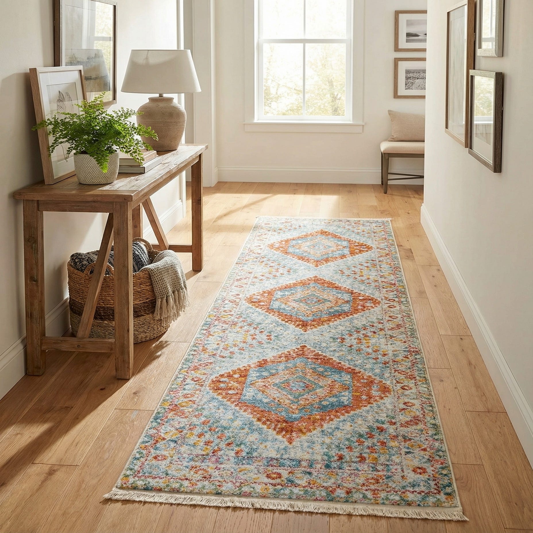 Primary color is Salmon. Colors in this rug include: Salmon, Blue, Green, Ivory, Red, Orange.
