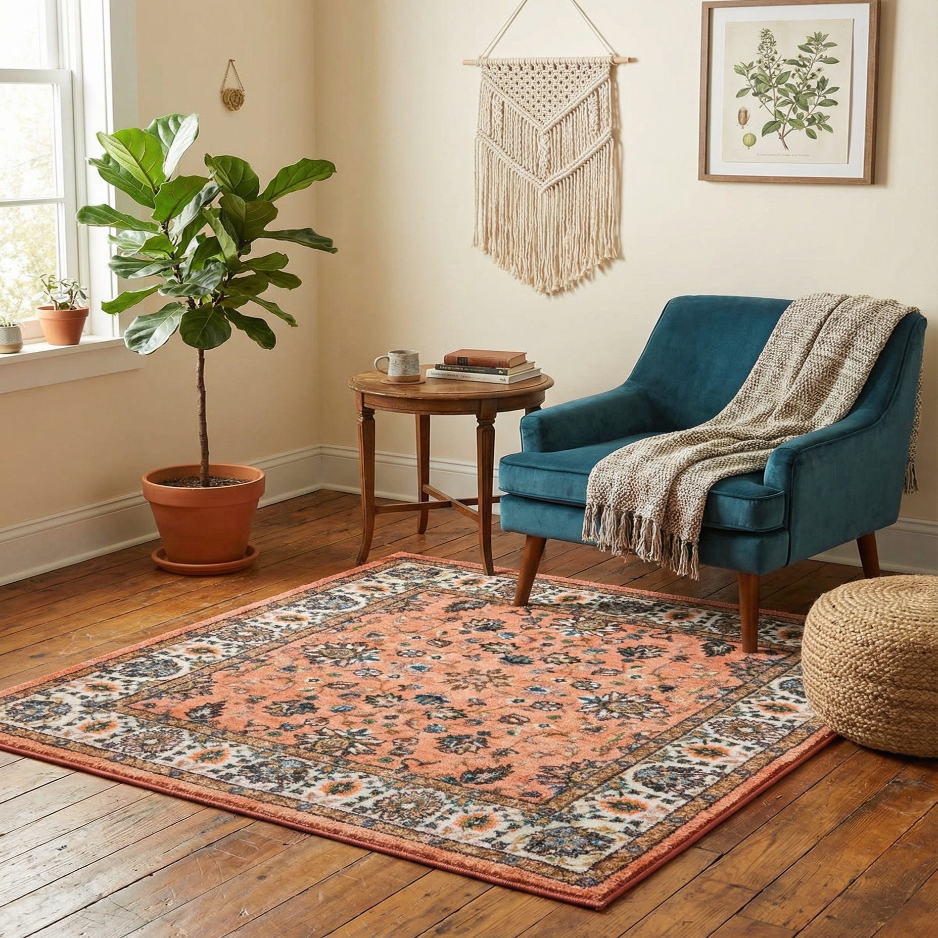 Primary color is Salmon. Colors in this rug include: Salmon, Black, Blue, Light Brown, Pink, Ivory.