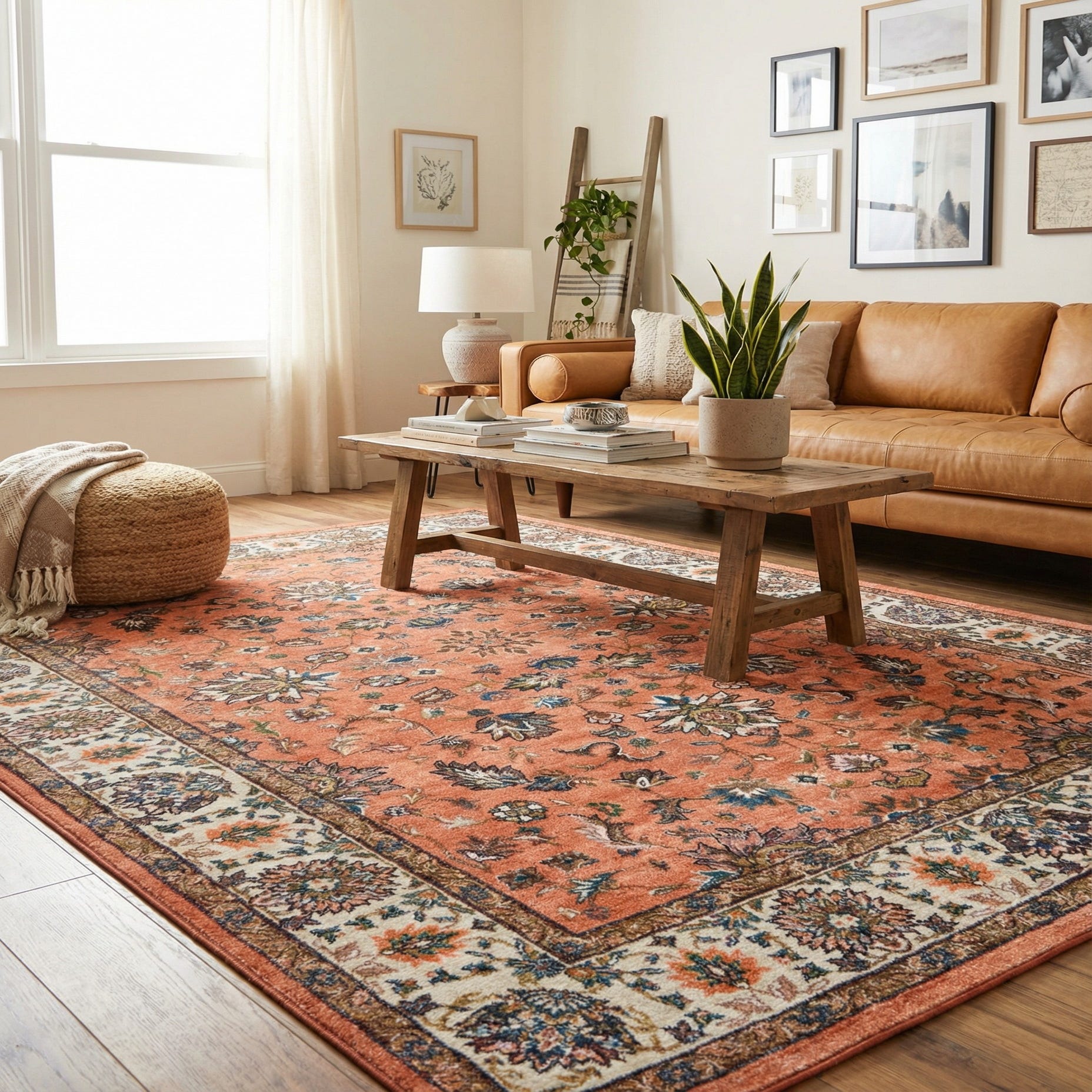 Primary color is Salmon. Colors in this rug include: Salmon, Black, Blue, Light Brown, Pink, Ivory.