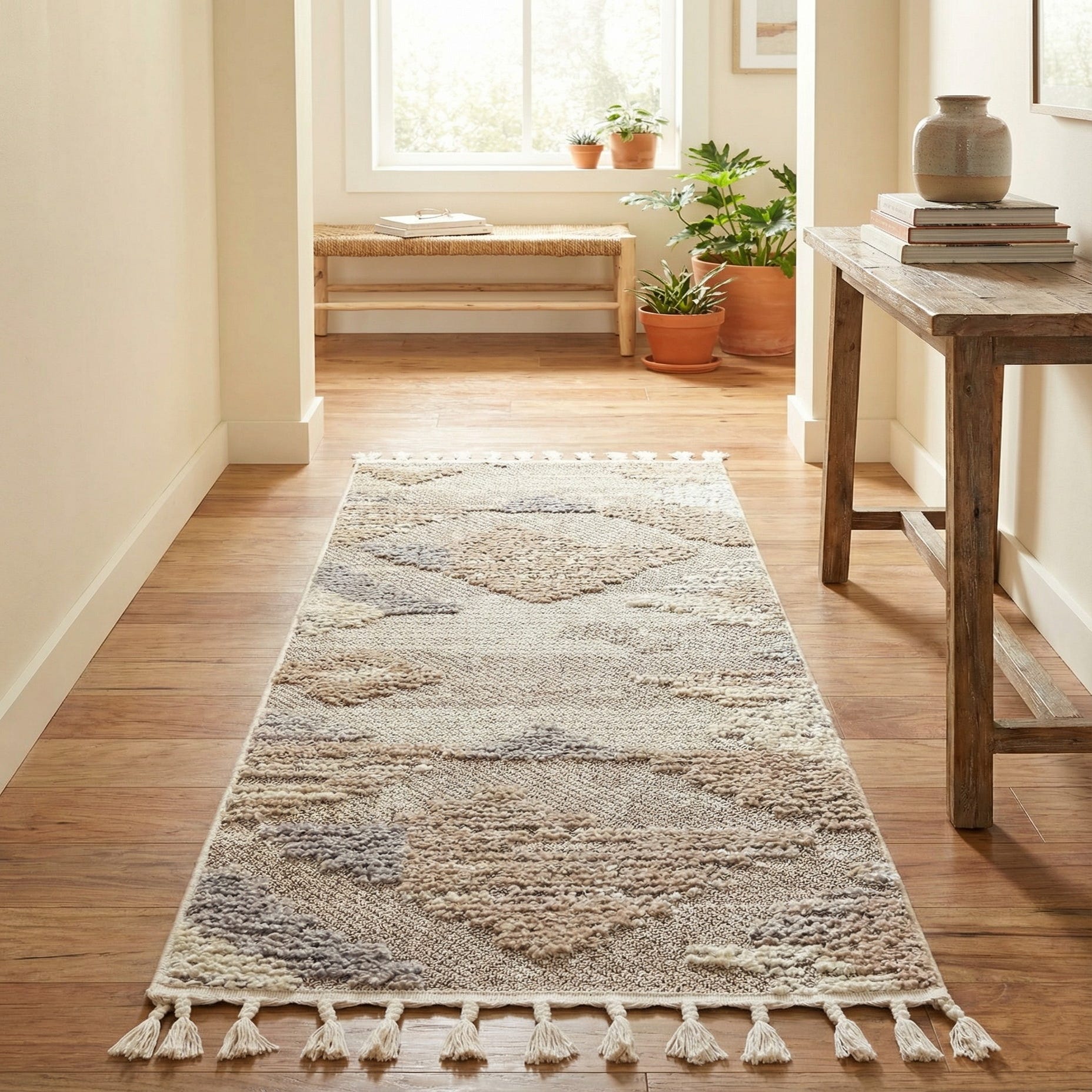 Primary color is Sand. Colors in this rug include: Sand, Gray, Ivory.