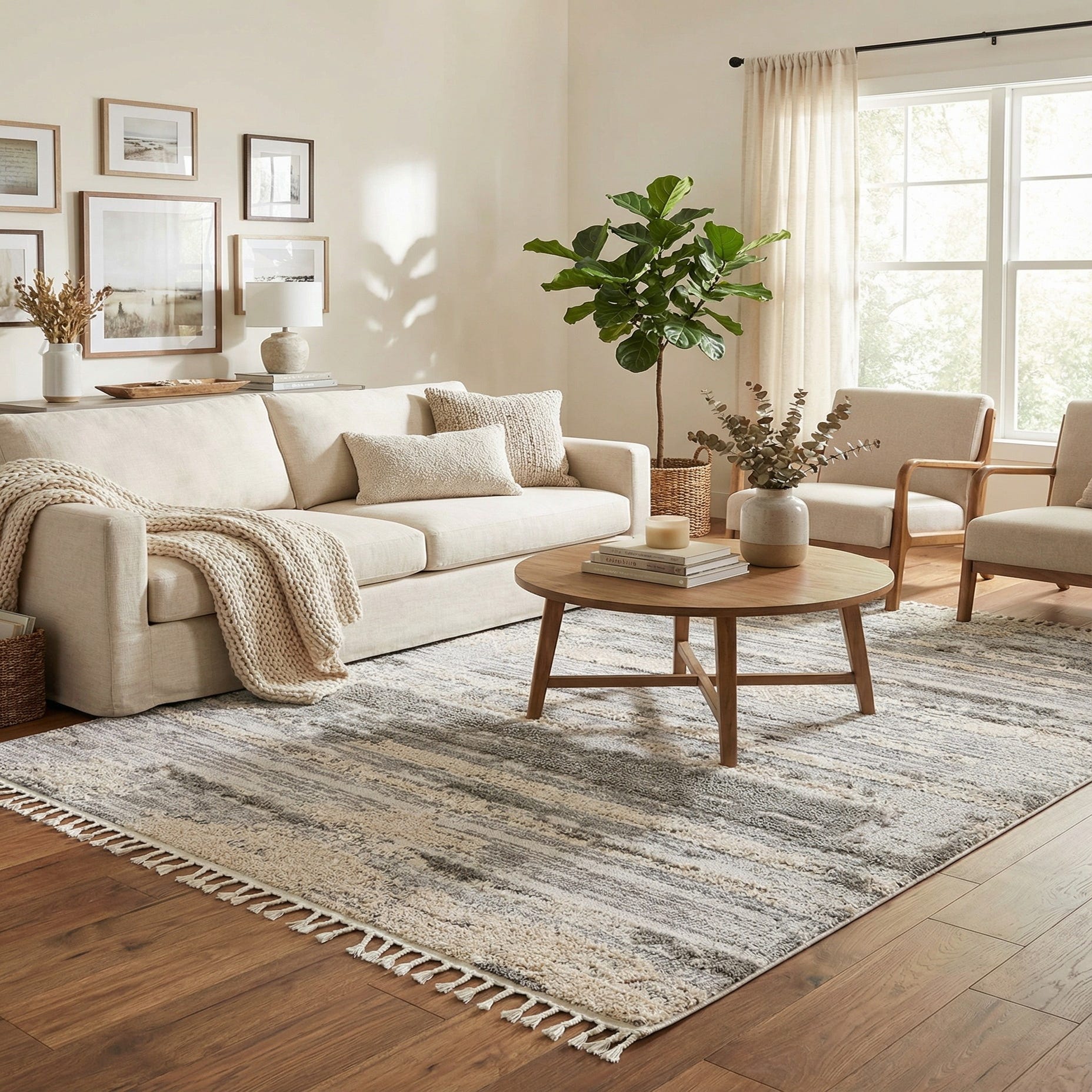 Primary color is Sand. Colors in this rug include: Sand, Gray.