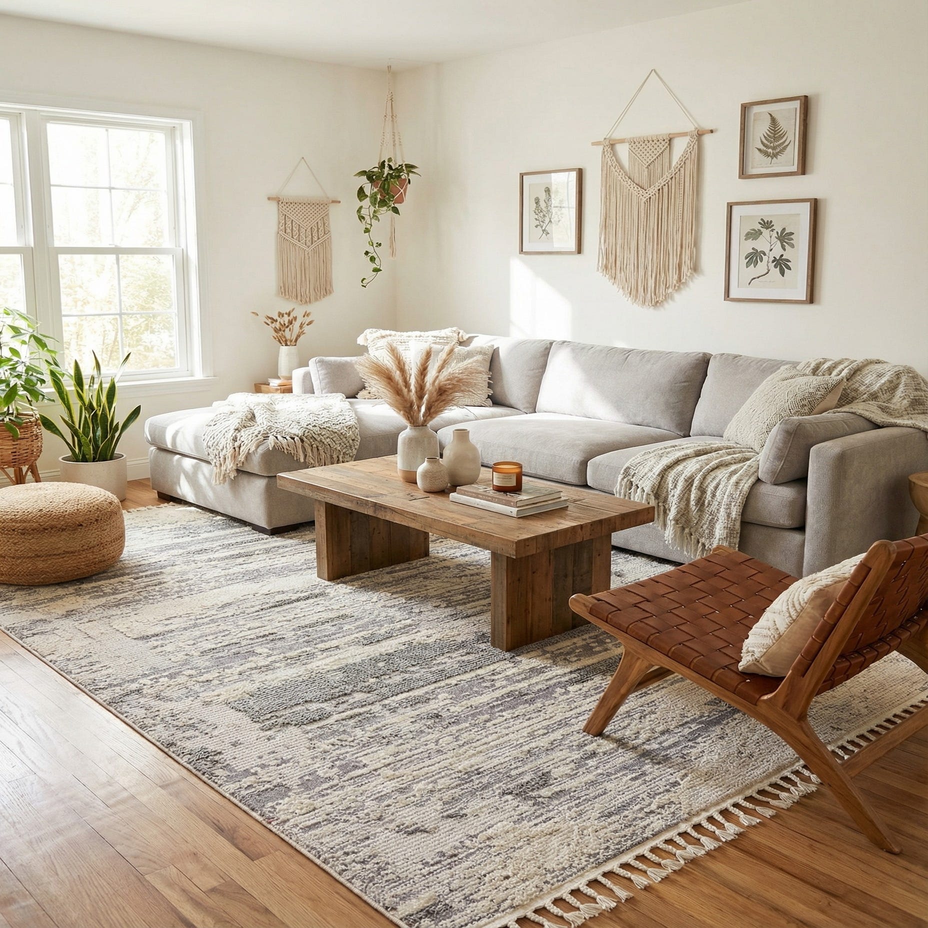 Primary color is Sand. Colors in this rug include: Sand, Gray.