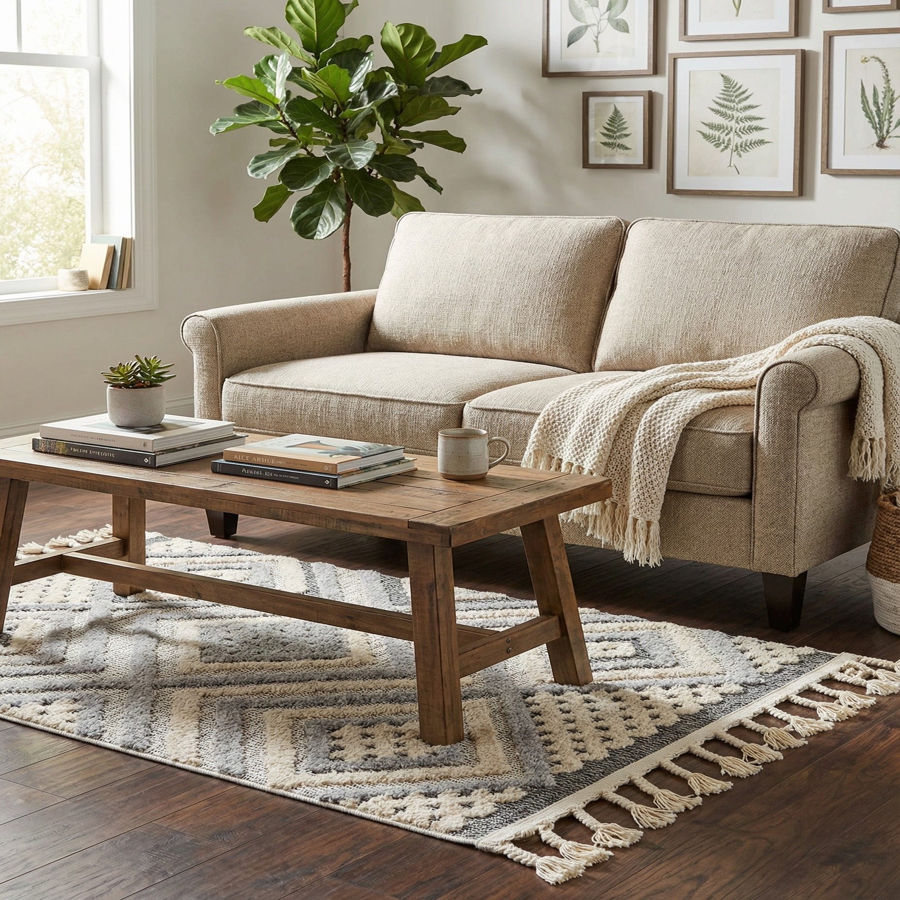 Primary color is Sandy Beige. Colors in this rug include: Sandy Beige, Beige, Black, Gray.